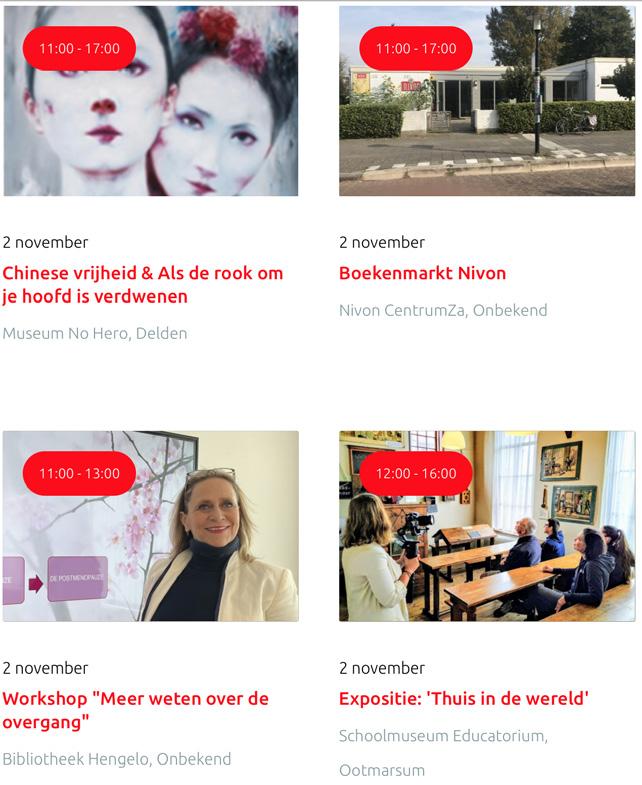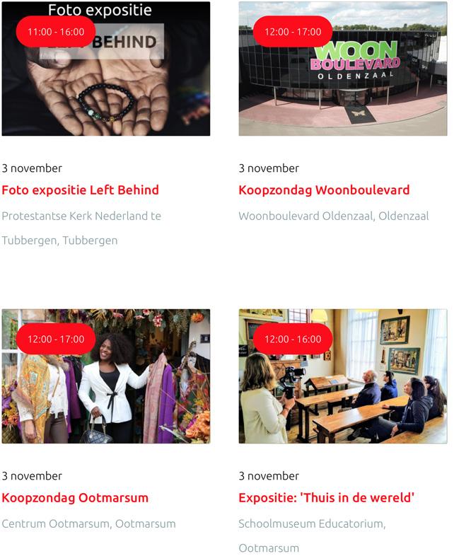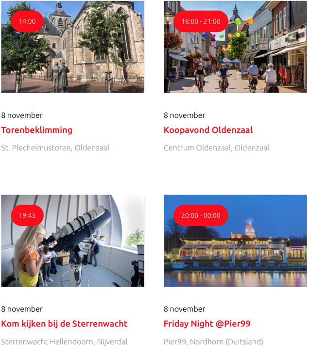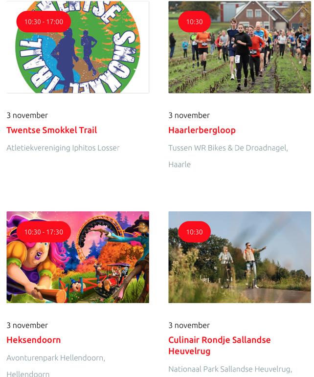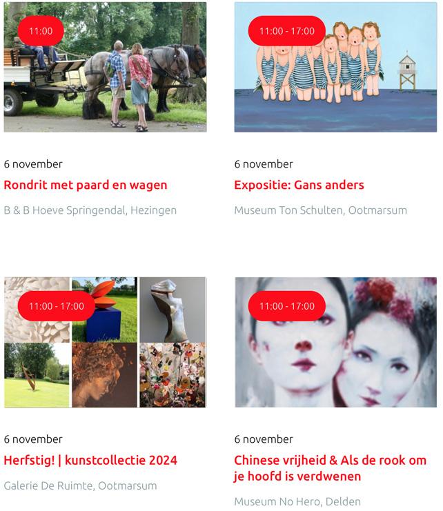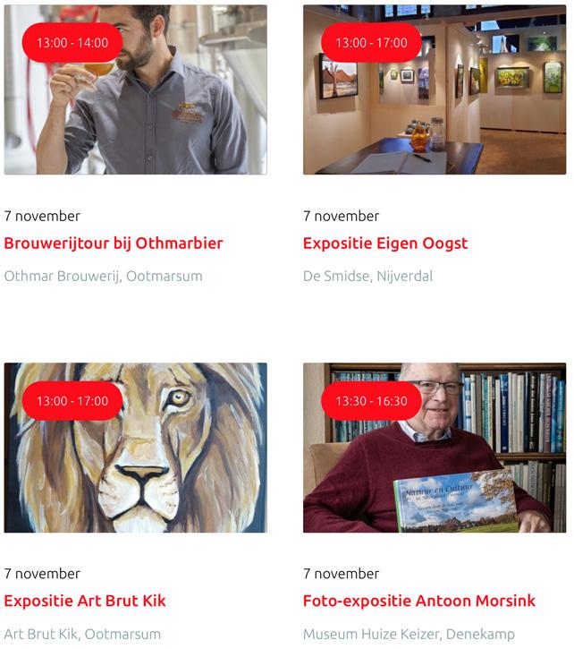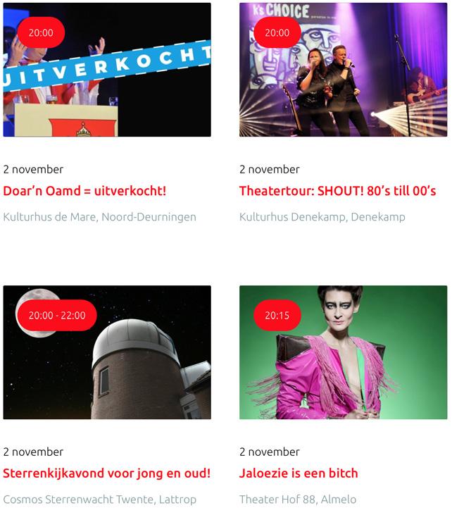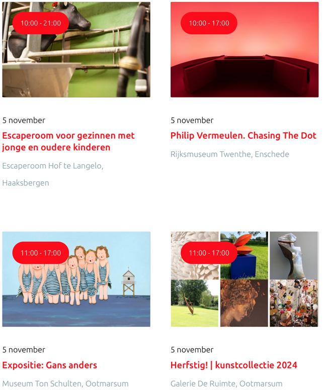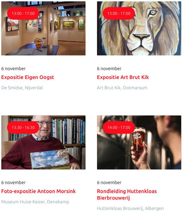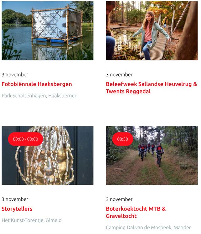 Voor een actueel overzicht kijk op: www.visittwente.nl/uitagenda of www.uittwente.nl. Evenementen en activiteiten aanmelden kan via de plaatselijke VVV/Tourist Info en redactie@twentejournaal.nl