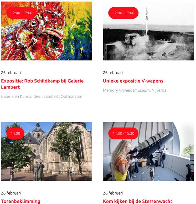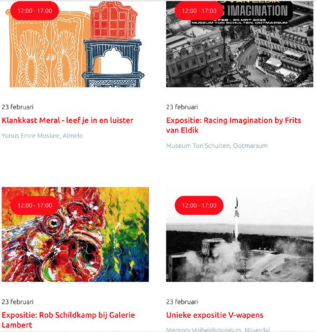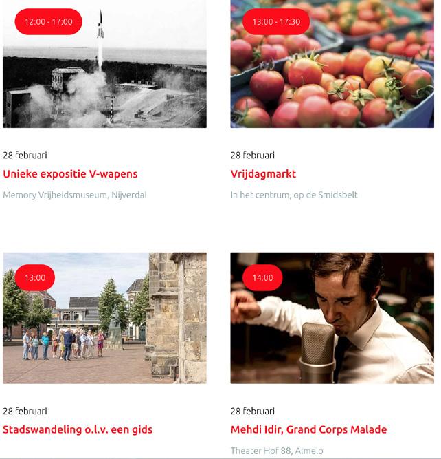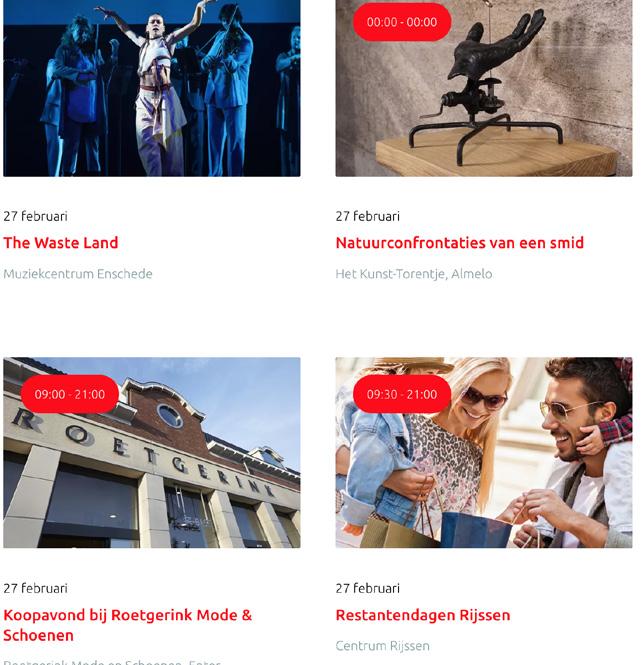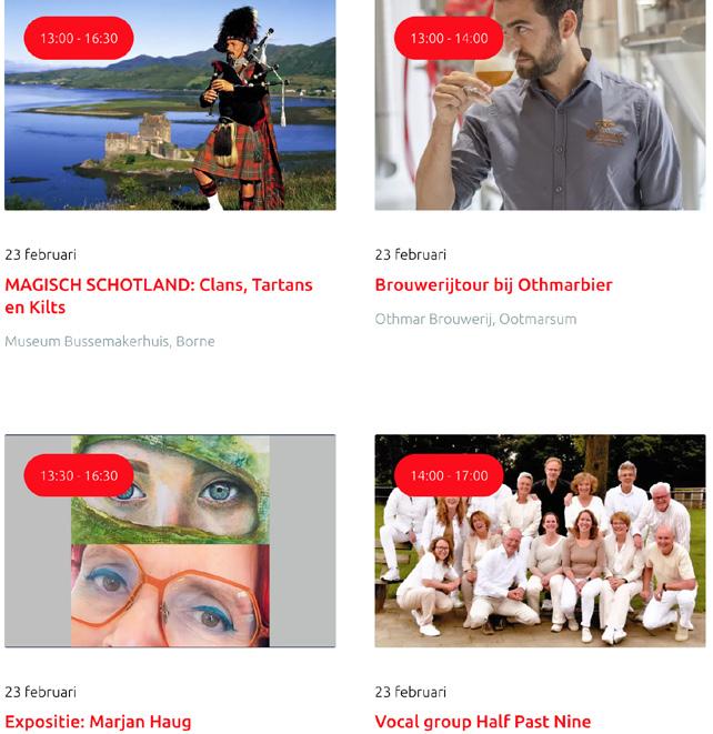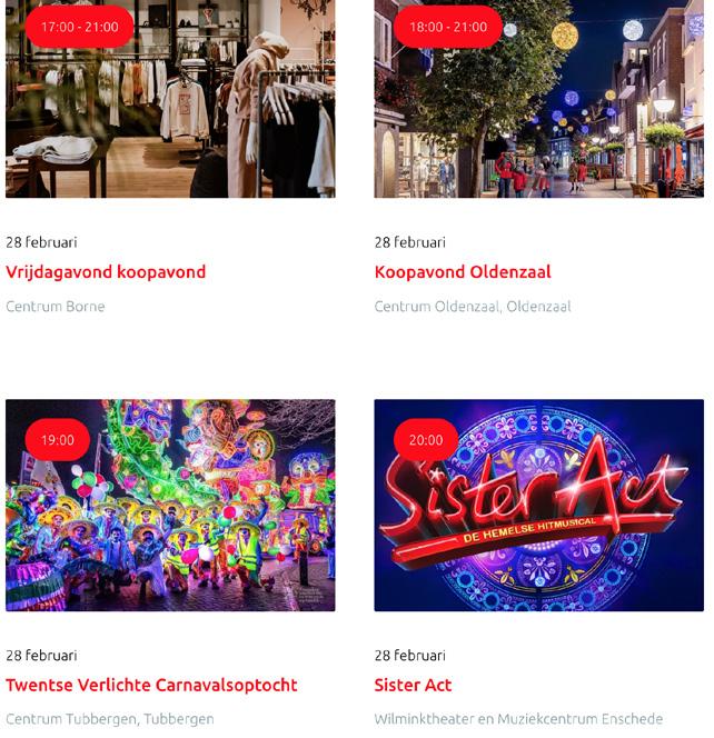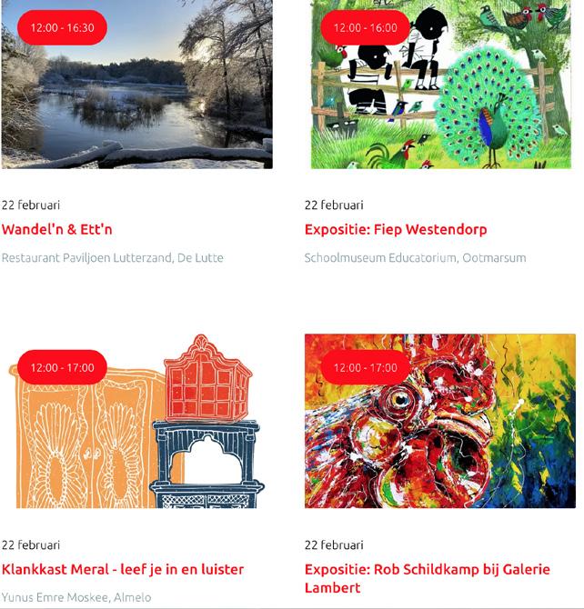 Voor een actueel overzicht kijk op: www.visittwente.nl/uitagenda of www.uittwente.nl. Evenementen en activiteiten aanmelden kan via de plaatselijke VVV/Tourist Info en redactie@twentejournaal.nl
