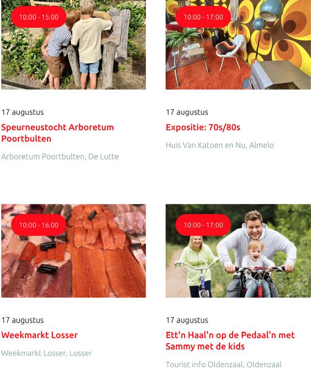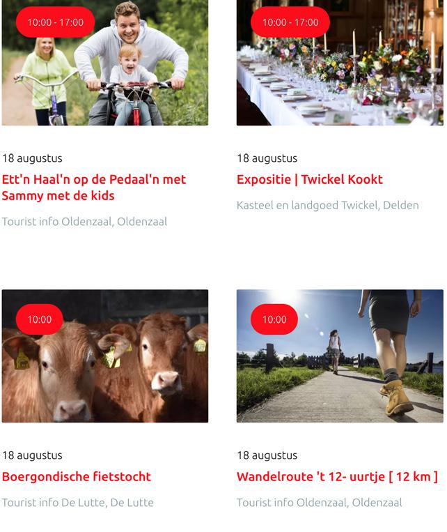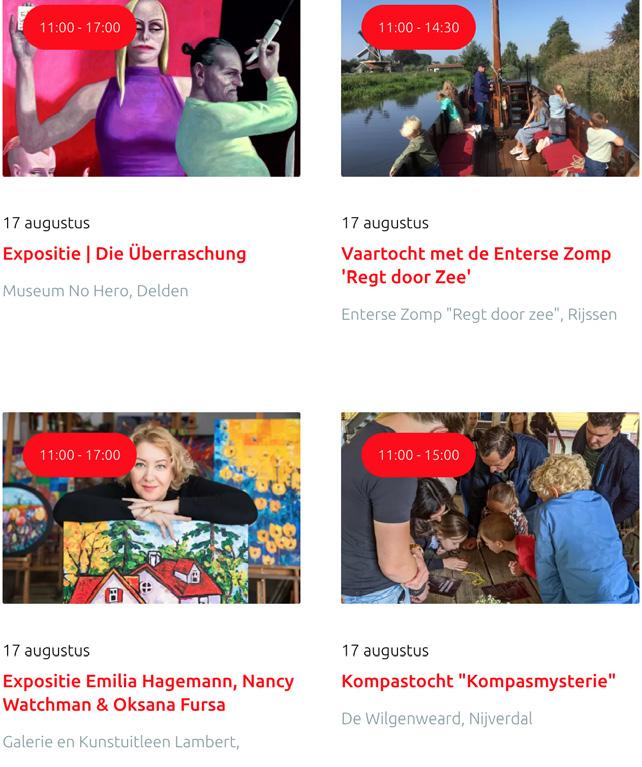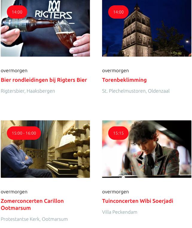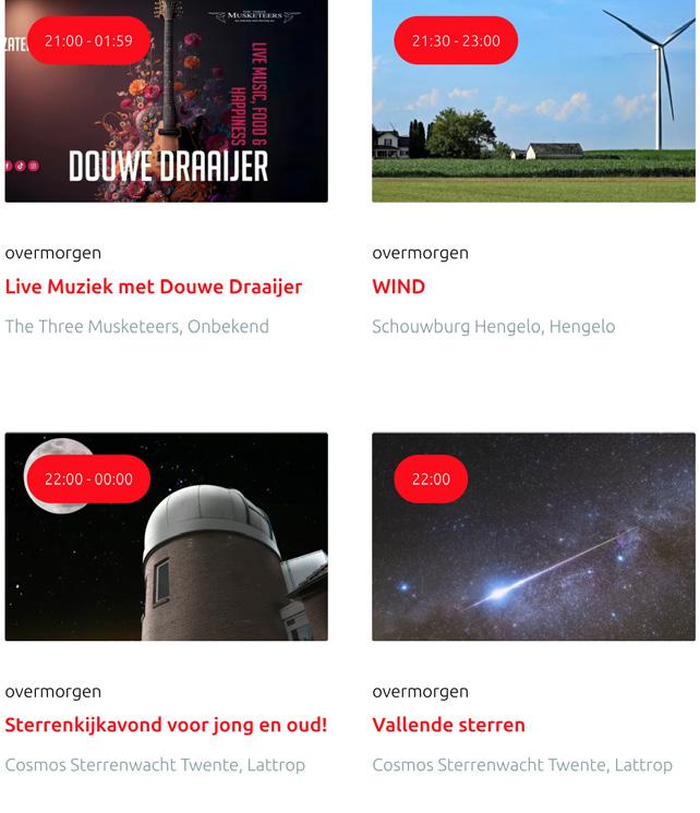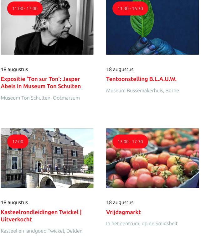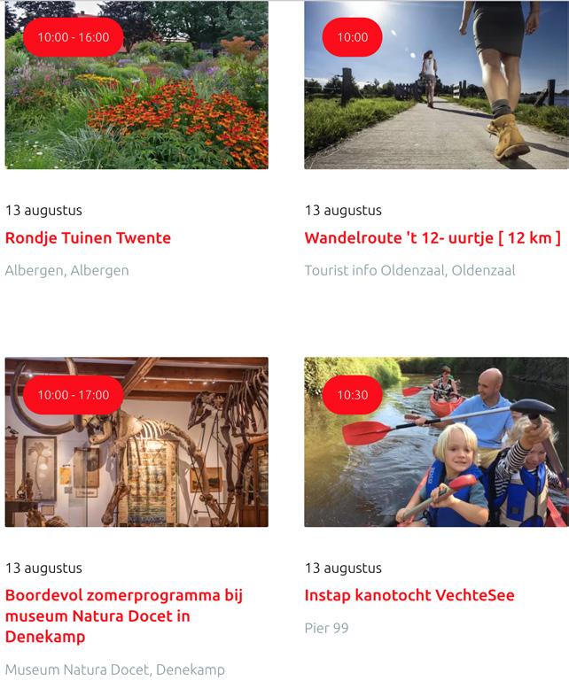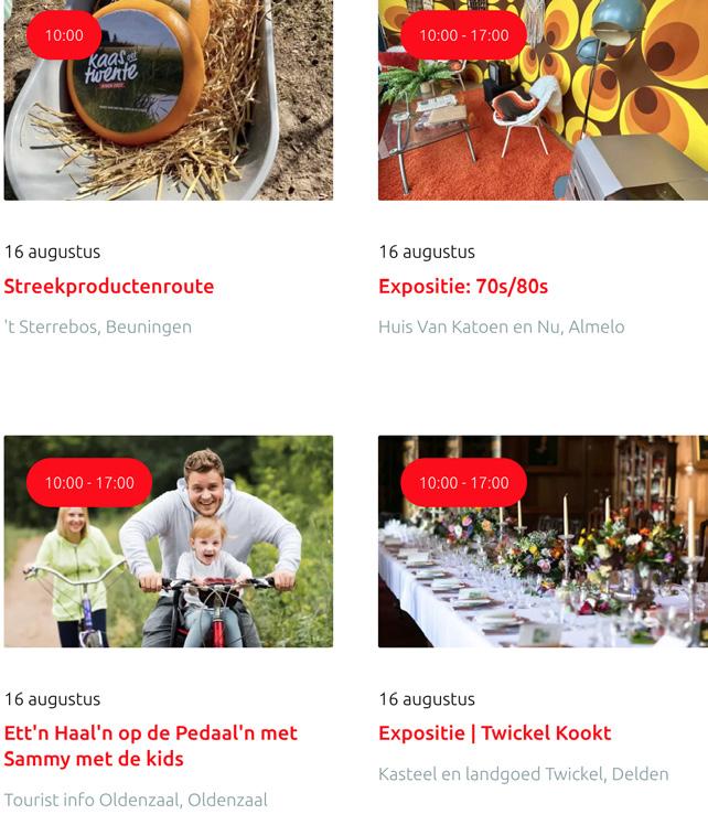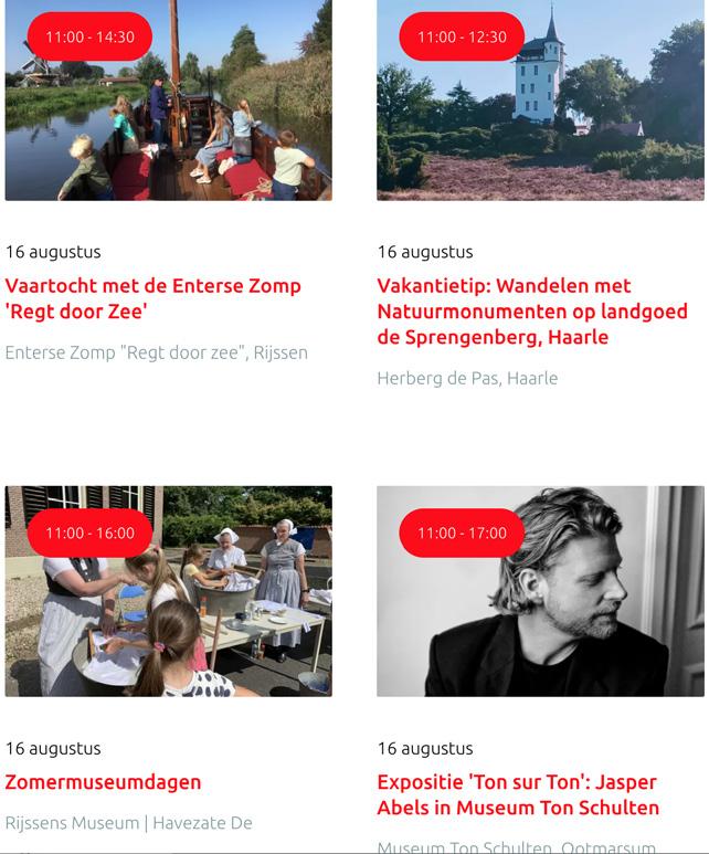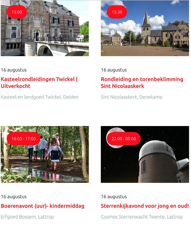 Voor een actueel overzicht kijk op: www.visittwente.nl/uitagenda of www.uittwente.nl. Evenementen en activiteiten aanmelden kan via de plaatselijke VVV/Tourist Info en redactie@twentejournaal.nl