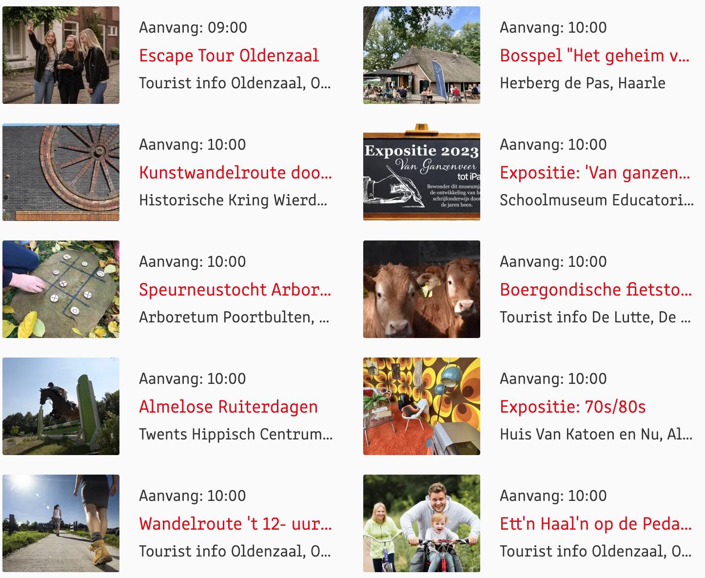 Voor een actueel overzicht kijk op: www.visittwente.nl/uitagenda of www.uittwente.nl. Evenementen en activiteiten aanmelden kan via de plaatselijke VVV/Tourist Info en redactie@twentejournaal.nl