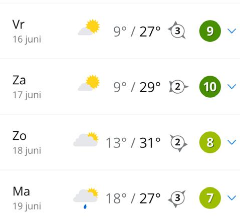 Ook de dagen daarna blijft de kans op enkele regen- of onweersbuien. Toch zullen er ook veel droge dagdelen zijn waarbij de zon schijnt. De temperatuur doet een stapje terug. Het wordt dagelijks 23 tot 26 graden. Dat is nog altijd een stuk warmer dan de 20 tot 22 graden die gebruikelijk zijn voor halverwege juni.