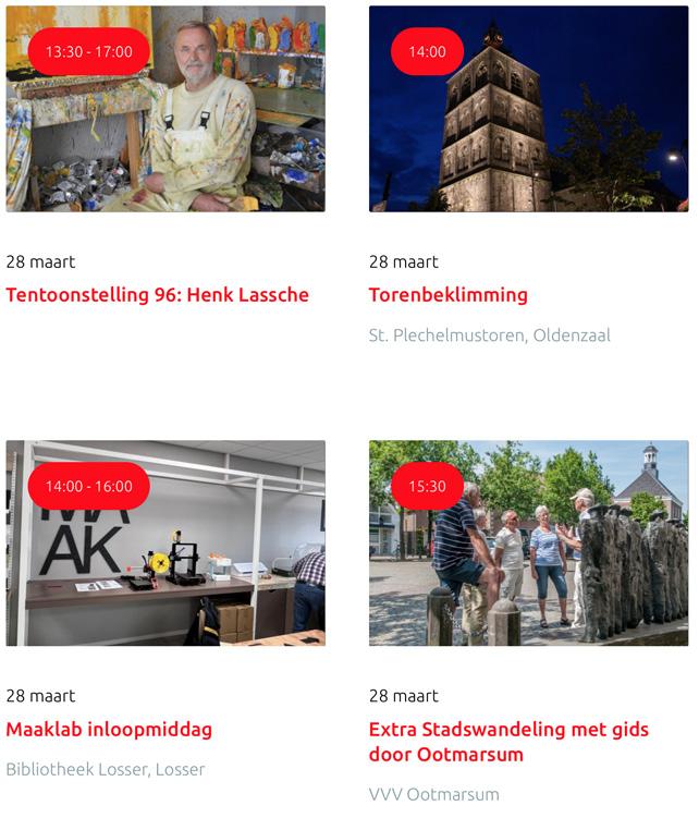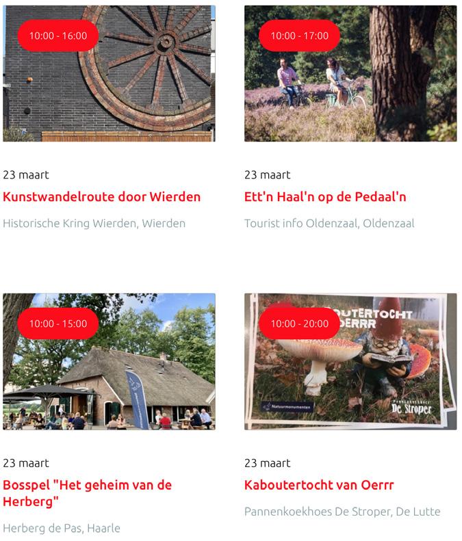 Voor een actueel overzicht kijk op: www.visittwente.nl/uitagenda of www.uittwente.nl. Evenementen en activiteiten aanmelden kan via de plaatselijke VVV/Tourist Info en redactie@twentejournaal.nl