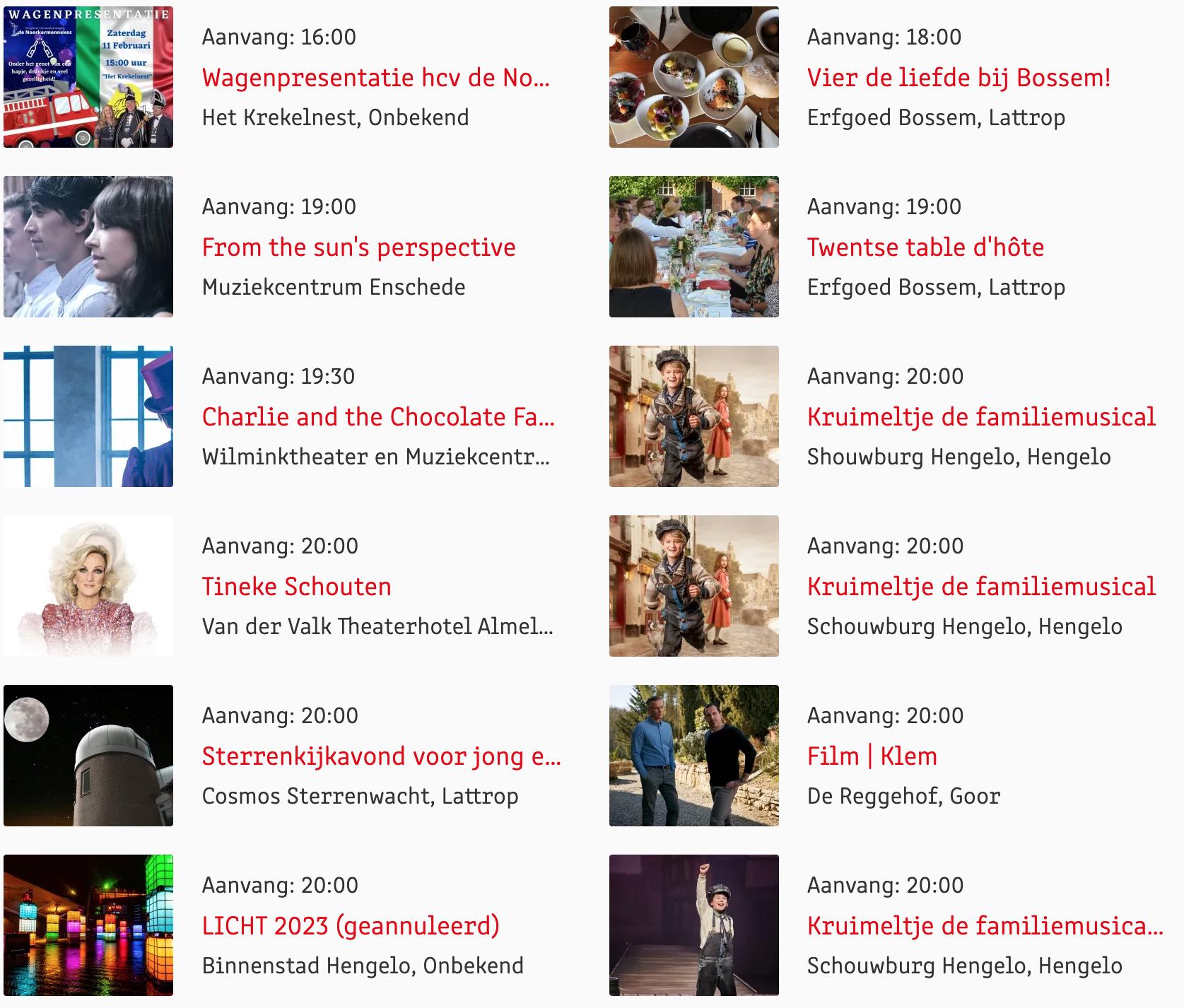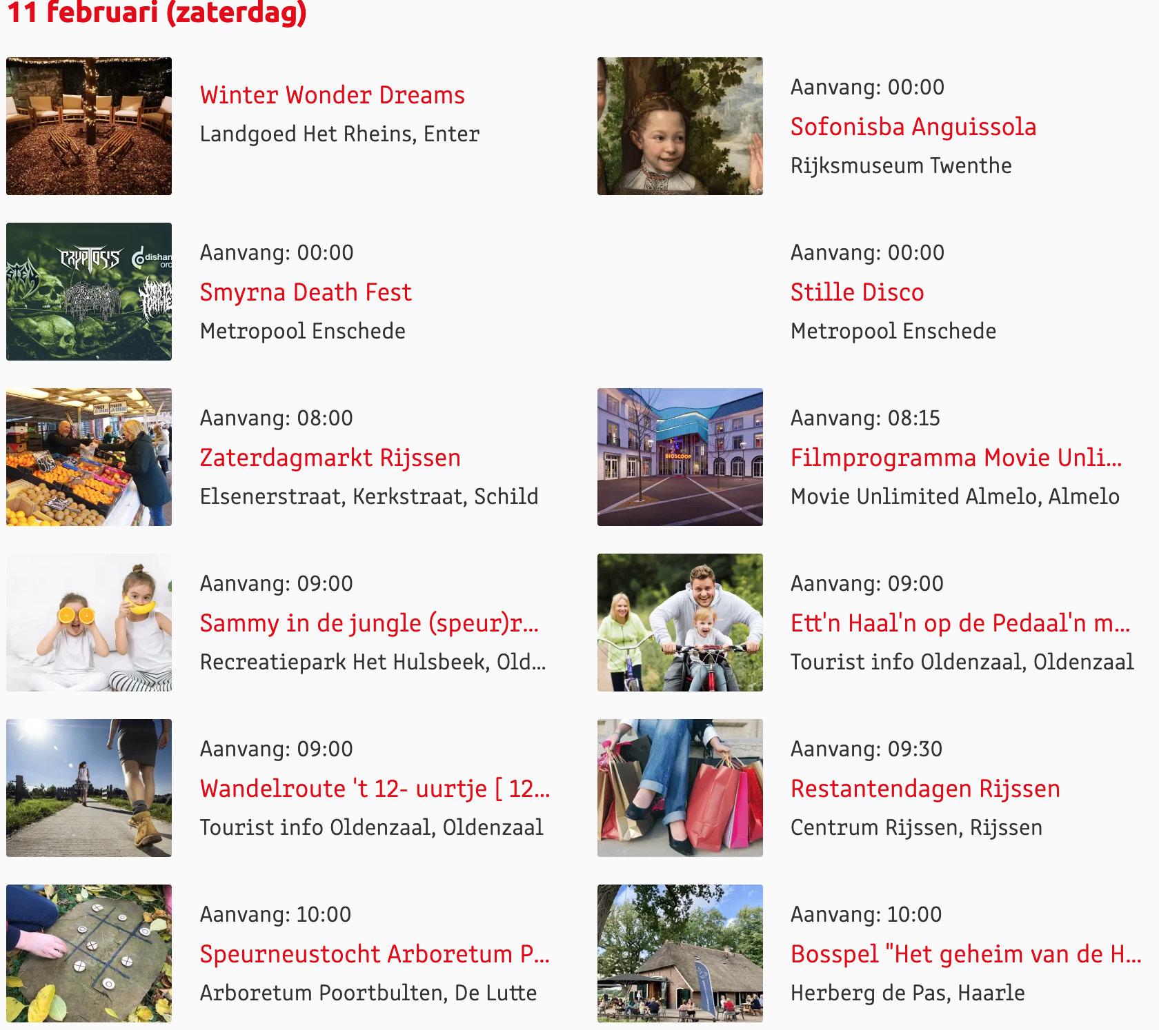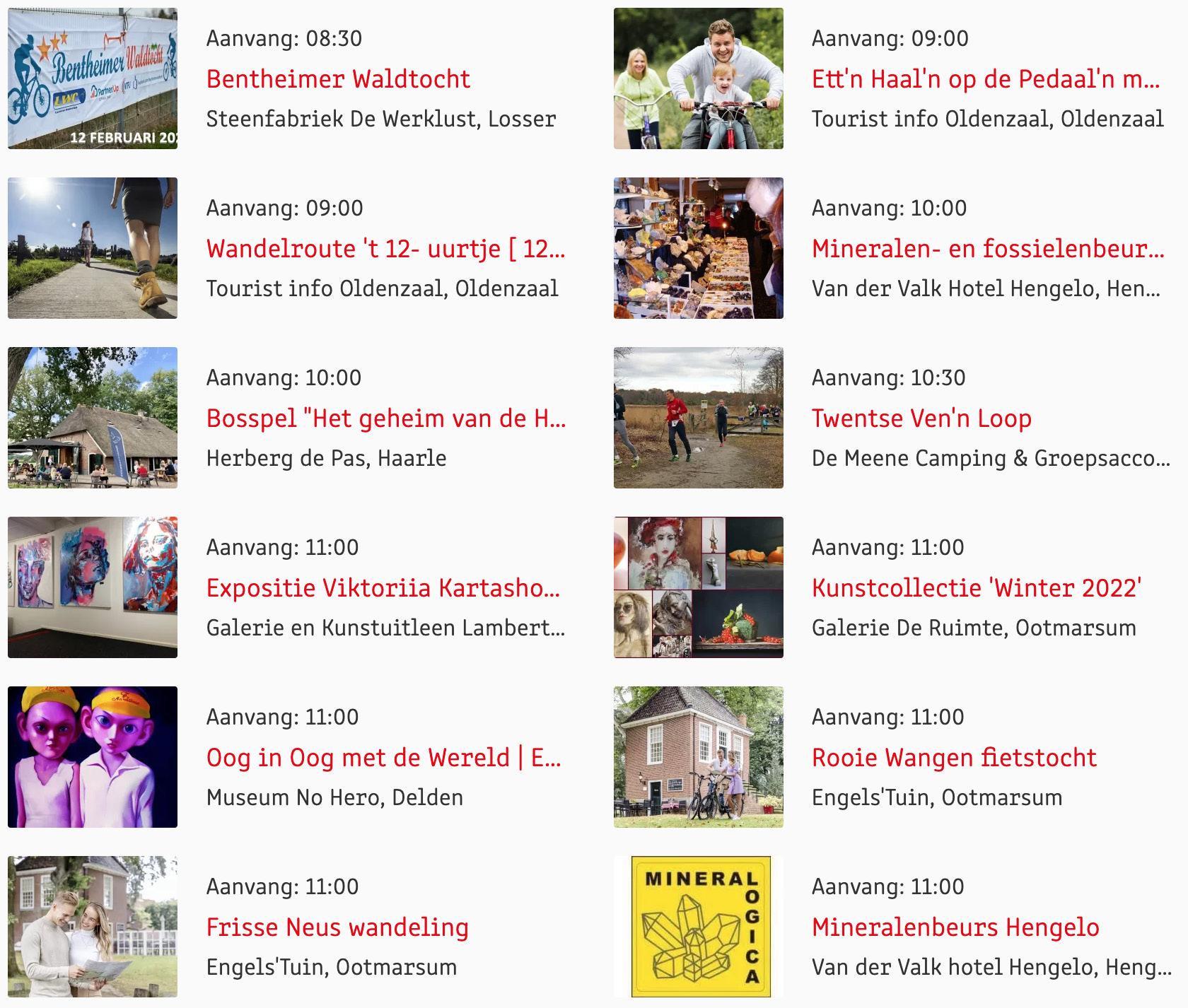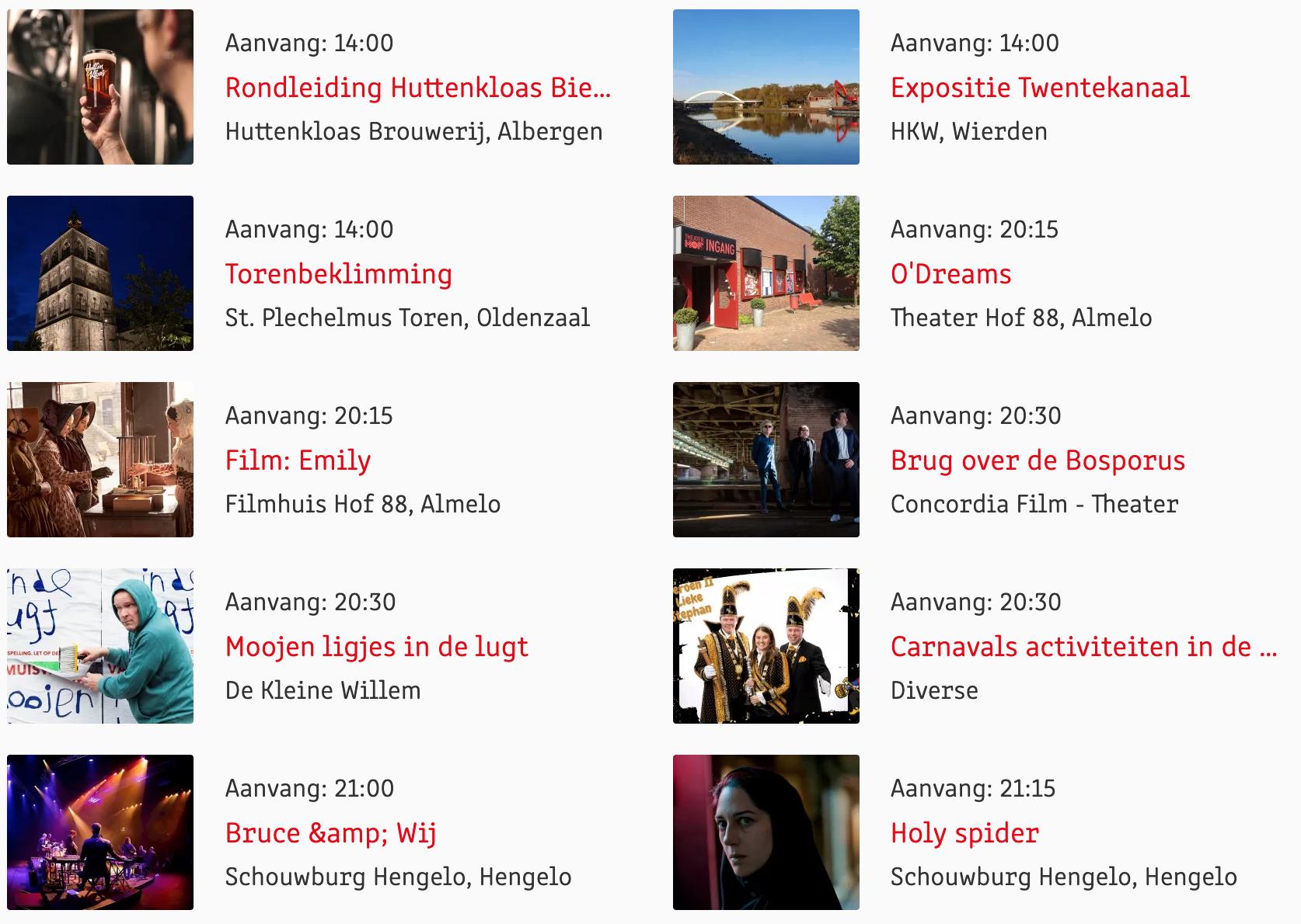 Voor een actueel overzicht kijk op: www.visittwente.nl/uitagenda of www.uittwente.nl. Evenementen en activiteiten aanmelden kan via de plaatselijke VVV/Tourist Info en redactie@twentejournaal.nl