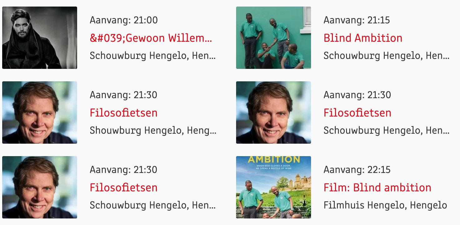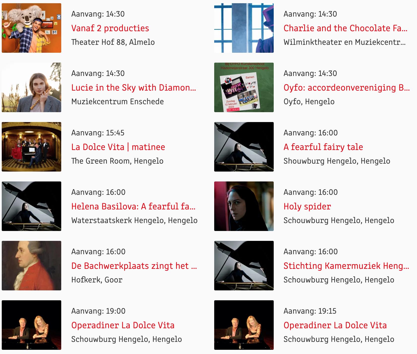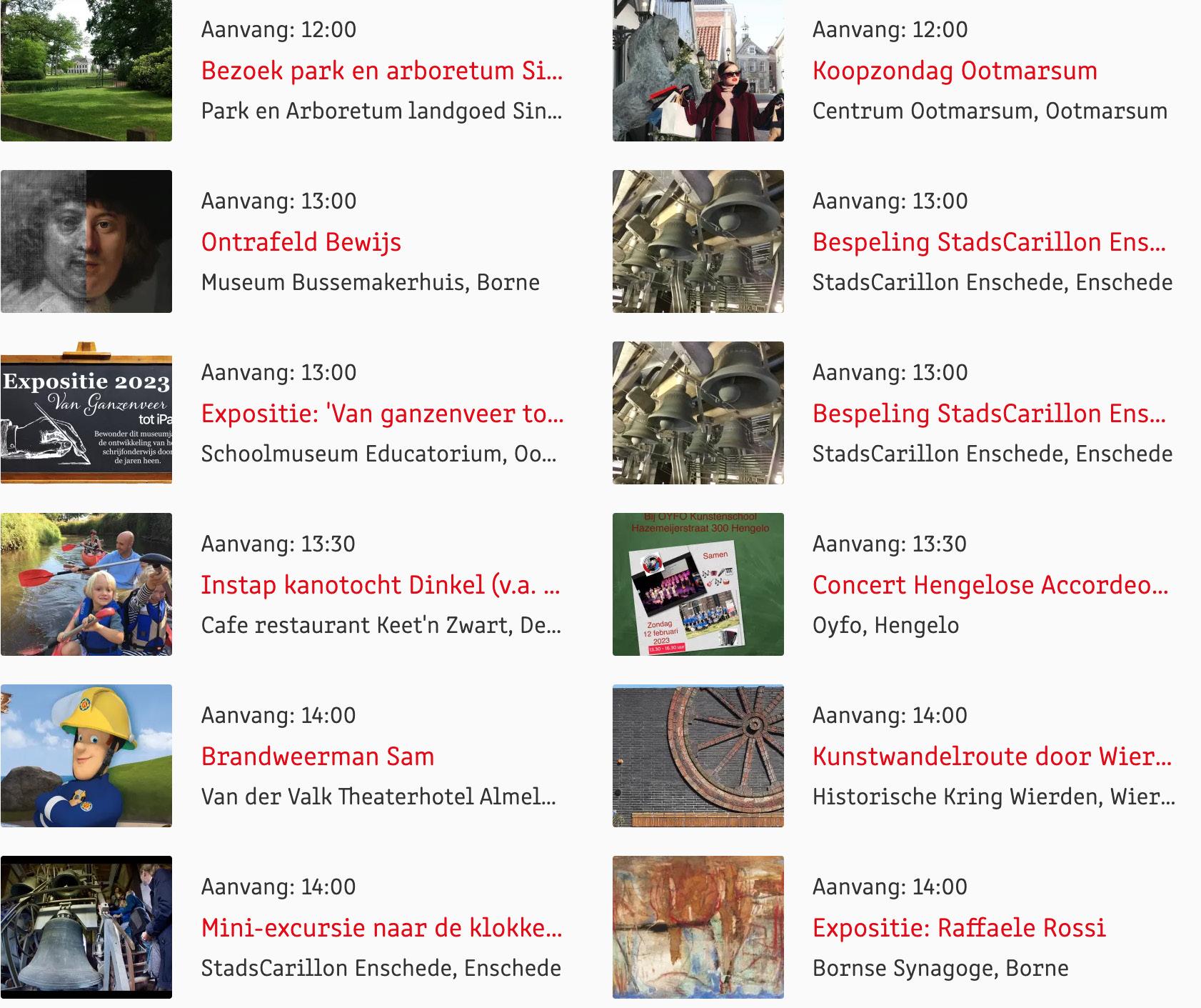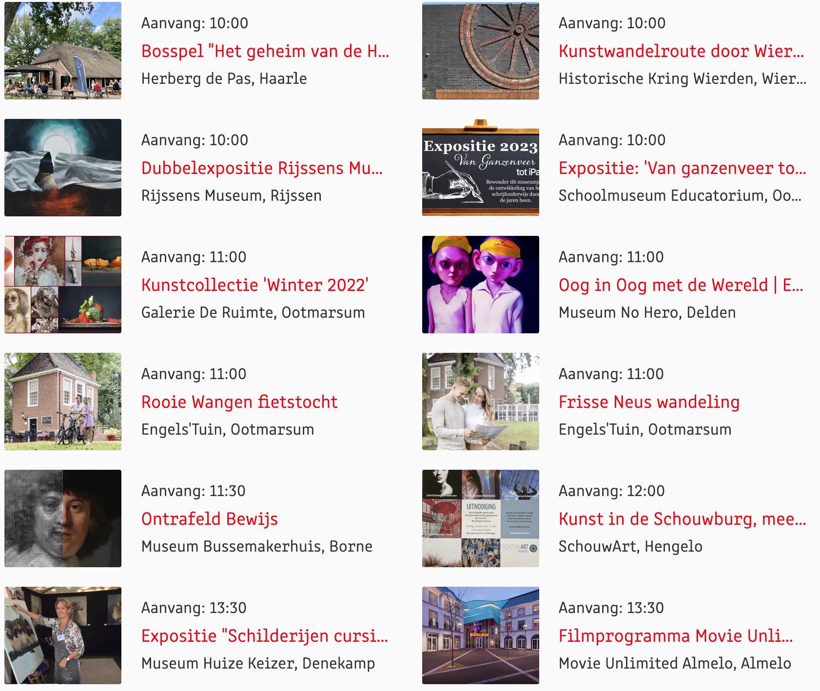 Voor een actueel overzicht kijk op: www.visittwente.nl/uitagenda of www.uittwente.nl. Evenementen en activiteiten aanmelden kan via de plaatselijke VVV/Tourist Info en redactie@twentejournaal.nl