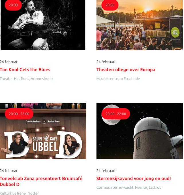 Voor een actueel overzicht kijk op: www.visittwente.nl/uitagenda of www.uittwente.nl. Evenementen en activiteiten aanmelden kan via de plaatselijke VVV/Tourist Info en redactie@twentejournaal.nl