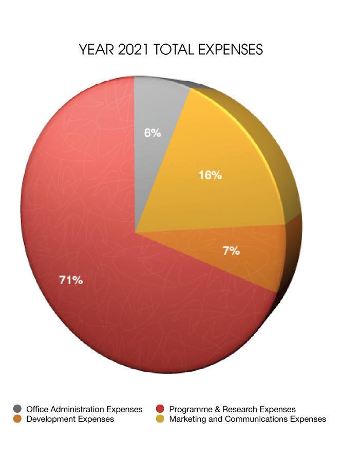 We continue to work hard to run a lean and efficient organisation. Our rule of thumb is that at least 65% of our annual operating budget is spent on programmes and research, which are our core focus areas, and that overhead and administrative expenses should not exceed 15%. I am pleased to report that for 2021, programme and research related costs accounted for 71% of our expenditure while our administrative expenses were tightly controlled at 6% in 2021 (similar level as in 2020).