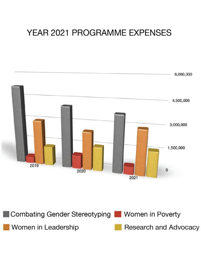 10 AUNNAL REPORT 2021 FINANCIAL HIGHLIGHTS YEAR 2021 TOTAL EXPENSES INCOME 2021 0% YEAR 2021 PROGRAMME EXPENSES Office Administration Expenses Development Expenses Programme & Research Expenses Marketing and Communications Expenses Corporate Donations Women in Poverty Individual Donations Women in Leadership Interest Income Combating Gender Stereotyping Research and Advocacy