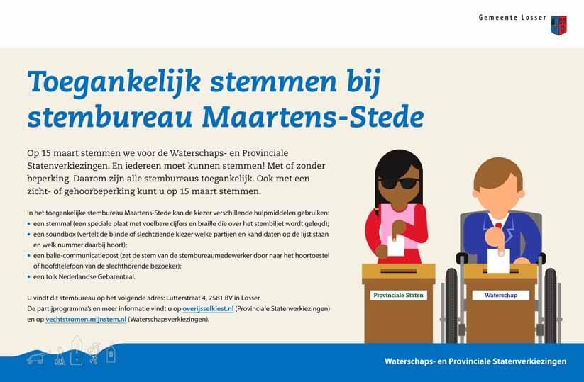 Het college van burgemeester en wethouders van Losser heeft besloten om voor 15 maart bij een aantal stembureaus een tijdelijke algemene invalidenparkeerplaats in te richten. Dit besluit geldt alleen op de dag van de verkiezingen. Hiervoor is een verkeersbesluit genomen dat op woensdag 1 maart is gepubliceerd in het digitale Gemeenteblad (www.officielebekendmakingen.nl).