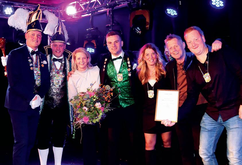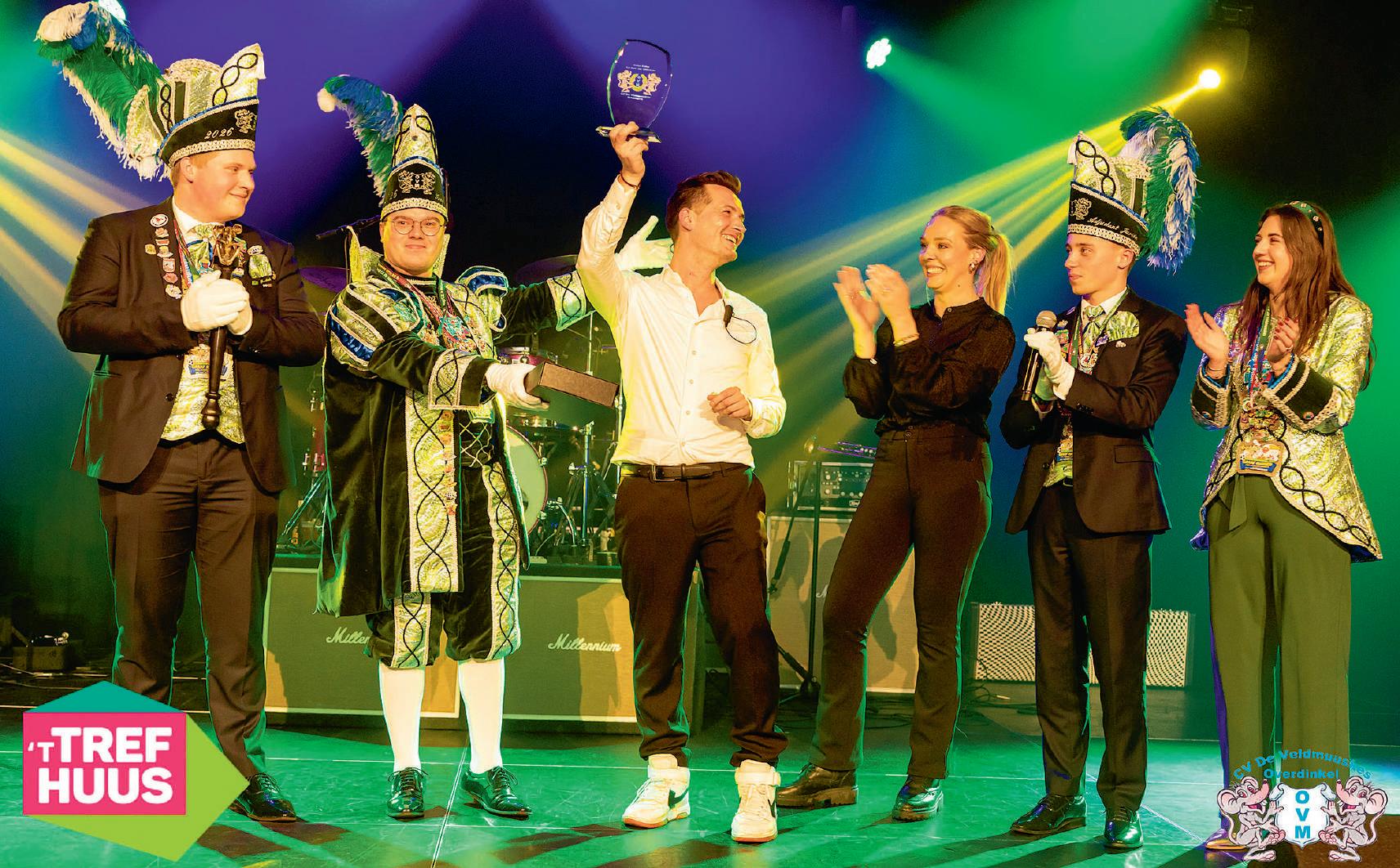 fan, waardoor ’t Trefhuus echt ‘ons’ Trefhuus is geworden. Een plek waar iedere inwoner van Overdinkel deel kan nemen aan tal van activiteiten en iedereen altijd welkom is. Stefan mocht de bokaal in ontvangst nemen uit handen van graaf Rutger. Als afsluiter, ook wel de after party genoemd, waren de Gladjakkers van de partij om er zorg voor te dragen dat ook het laatste restje energie uit de bezoekers werd gezogen. De presentatie van de gehele avond was in handen van Sander Werger en Niels Bouwhuis, die dit met de nodige humor uitstekend volbrachten. Al met al kijken De Veldmuuskes en ’t Trefhuus terug op een bijzonder geslaagd