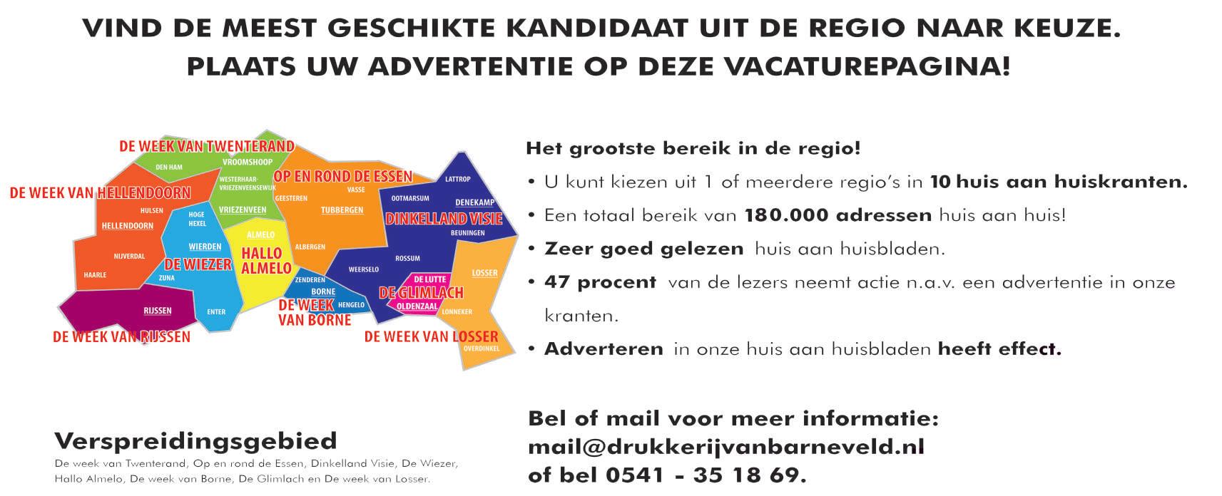 Wij zorgen graag voor een advertentie in dit blad op de familiepagina. Wil je advies of informatie? Bel drukkerij van Barneveld, 0541 –351869 of mail naar mail@drukkerijvanbarneveld.nl Wij reageren per mail binnen 24 uur. We sturen zonder meerprijs een vrijblijvende drukproef met een scherpe prijsopgave retour. Uiterste aanleverdatum voor plaatsing in de eerstvolgende uitgave: maandagmorgen 10.00 uur.
