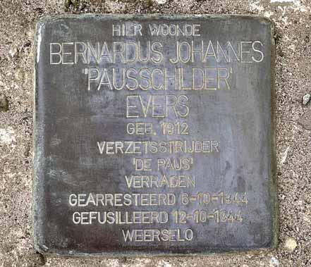 De Stolperstein als herinnering aan de gefusilleerde verzetsman Bernard Evers.