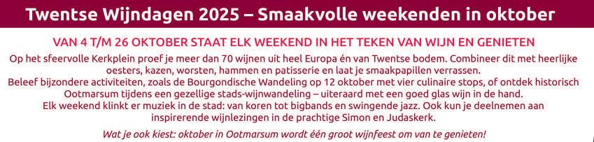 Elke woensdag en donderdag in Denekamp, Ootmarsum, Tilligte, Lattrop, Noord Deurningen, Beuningen, Groot Agelo, Breklenkamp, Weerselo, Saasveld, Deurningen en Rossum.