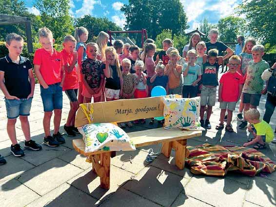 beeld van tante Truus achter.” Van de collega’s kreeg Ine een ‘Walk of fame’ tegel aangeboden. Deze wordt op het speelterrein neergelegd. “Meester Jasper, ik heb in deze 42 jaar nog nooit over mij heen laten lopen. Dit wordt dan de eerste keer”, zei Ine lachend. Twee collega’s zongen een heel mooi lied gebaseerd op 42 jaar juf Ine (Tante Truus): “Op school in Rossum, De Kerkewei genoemd, daar werkt juffrouw Ine in héél Rossum beroemd. Iedere morgen op de fiets door weer en wind. Vol goede moed naar school toe, een nieuwe dag begint. Een tweede moeder, bij tranen, snot en pijn.” Zie vervolg elders in dit blad Ine Diepenmaat neemt na 42 jaar afscheid van basisschool De Kerkewei in Rossum