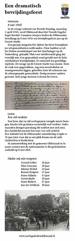 Acht jonge Oldenzalers verloren op 8 mei 1945 tijdens het bevrijdingsfeest het leven. Dat is jaren lang voor de nabestaanden ‘een stil verdriet’ geweest. Er was letterlijk geen plek om de slachtoffers te gedenken.