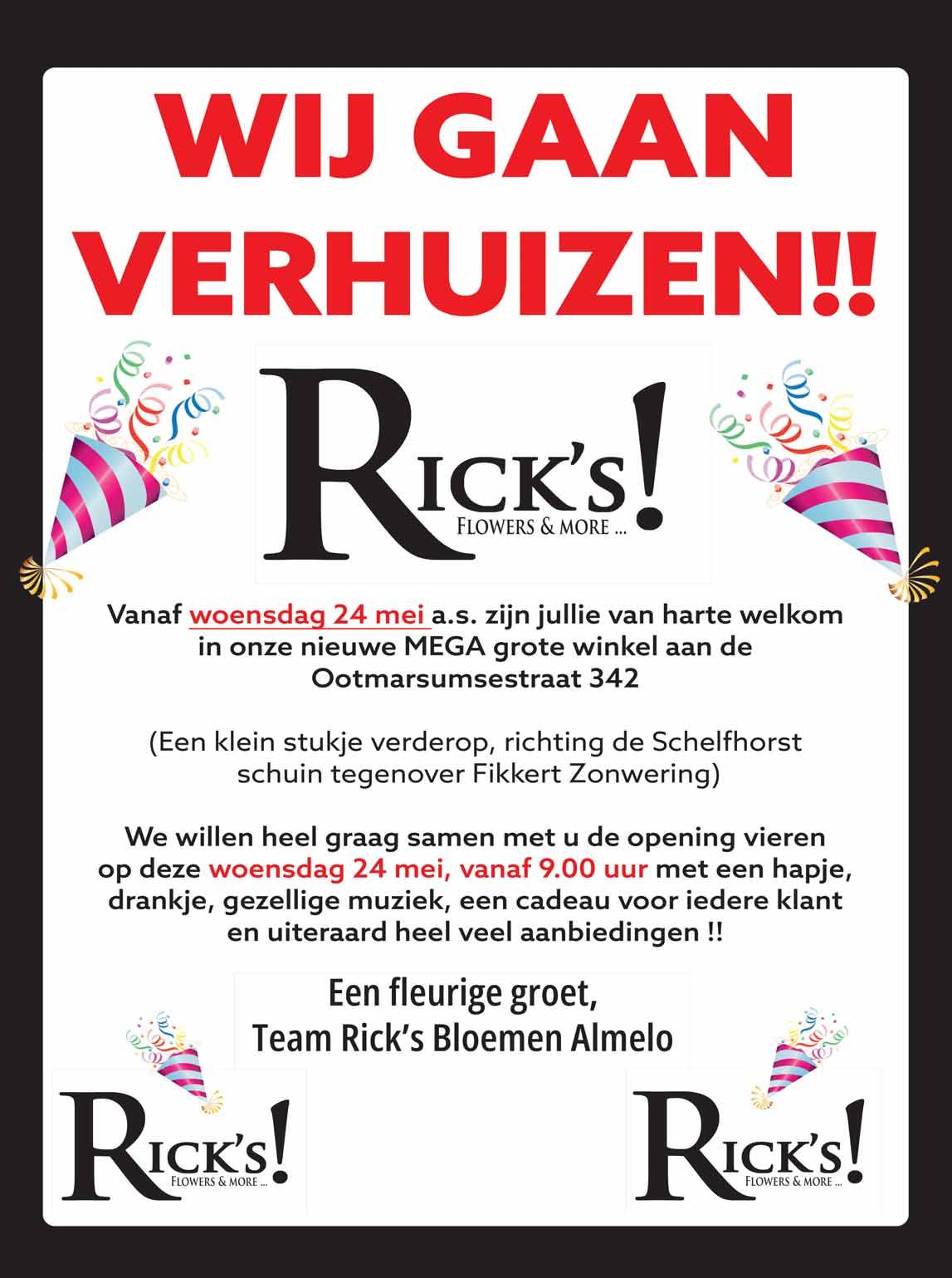 Woensdag 24 mei is de opening van de nieuwe winkel aan de Ootmarsumsestraat 342. Dit wordt gevierd met heel veel aanbiedingen, gezellige muziek, een hapje en een drankje en voor iedere klant een leuk cadeau. Rick’s Bloemen maakt er dus een mooi en gezellig spektakel van.
