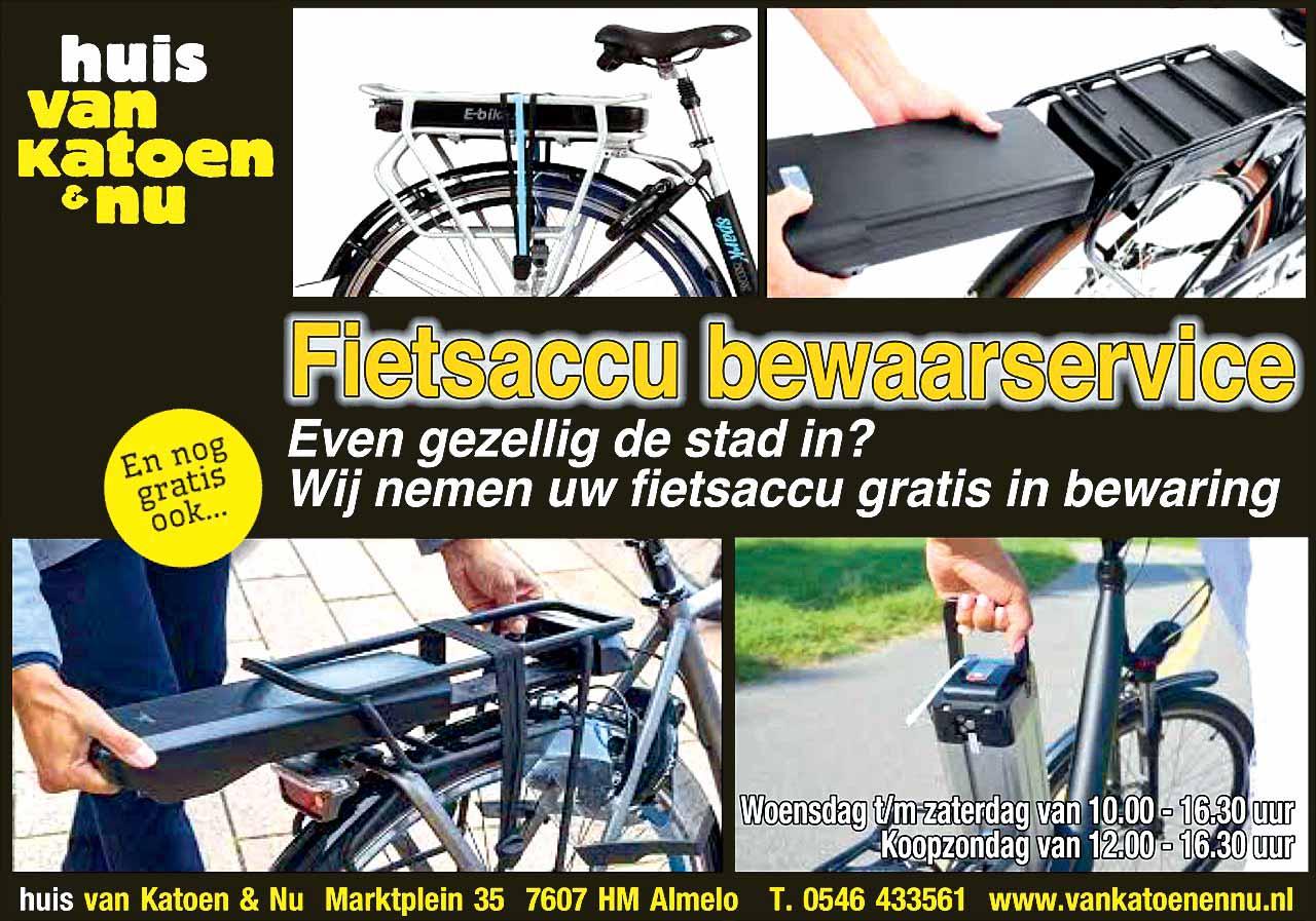 Voor wie met de elektrische fiets komt, is het mogelijk om zijn fietsaccu gratis in bewaring te laten nemen bij het Huis van Katoen en Nu. U kunt dan met een gerust hart het centrum van Almelo in, zonder dat u zich zorgen hoeft te maken over uw elektrische fiets.