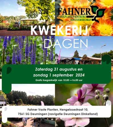Op zaterdag 31 augustus en zondag 1 september 2024 van 10.00 uur tot 16.00 uur zijn weer de jaarlijks terugkerende kwekerijdagen van Fahner Vaste Planten aan de Hengelosestraat 10, 7561 SG in Deurningen (navigatie Deurningen Dinkelland). Dat is aan de rijksweg tussen Hengelo en Oldenzaal, naast Frans op den Bult. De kwekerijdagen zijn voor bezoekers gratis toegankelijk (evenals de koffie en thee).