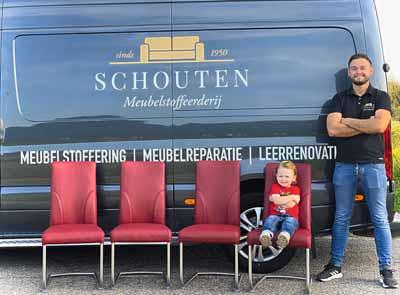 Voor ‘Foeke Schouten de derde’ was het logisch om ook in de meubelstoffeerderij te gaan. ‘’Ik ben er van jongs af aan ingegroeid. Mijn vijf oudere zussen zagen het niet zo zitten. Ik was een nakomeling. Ik ben erin gerold. Maar ik vind het hartstikke leuk.” Schouten repareert designmeubels, klassieke meubels en alles ertussenin. Het gaat dan om het bekleden, repareren en opnieuw vullen van stoelen en banken. Ook riet en rotan worden gerepareerd. “Rotan vlechten heb ik van mijn opa geleerd. Voor het bekleden heb ik een opleiding gevolgd. Maar het meeste leer je in de praktijk’’, aldus SchoutenSchouten mikt op de betere kwaliteitsmeubels. Die van ‘zeg maar Leen Bakker’ zijn niet de doelgroep, zo legt hij uit. De werkwijze is simpel: een afspraak maken en dan gaat Schouten bij de mensen langs. “Zodat we de meubels goed kunnen bekijken. We hebben een hele voorraad stalen stoffen bij ons. De mensen kunnen thuis uitkiezen. We meten alles op en doen een eerste prijsopgave bij de mensen thuis. Dat is geheel vrijblijvend. We ontzorgen de klant volledig. We halen alles op en brengen het weer terug en dat zit bij de prijs in. We vullen banken en stoelen op tot het gewenste zitcomfort. We zijn met een heel team, allemaal oude rotten in het vak, mensen met veel ervaring.’’Schouten heeft het druk in de regio Twente, maar heeft nog wel ruimte voor nieuwe orders. Hij houdt momenteel een tijdelijke actie met 20 procent korting. Belangstellenden in Rijssen kunnen bellen met (0548) 72 29 19. De derde en vierde generatie Foeke Schouten.