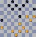 Gerrit Bosch (994) had duidelijk meer kaas gegeten van het klassieke spel dan zijn tegenstander Gerald van Ark (935). Na 56. 32-27 (?) werd de partij vaardig tot een winnend einde gebracht. Met 32-28 zou hij serieus voor een punt kunnen strijden. Als de veteraan uit Vriezenveen nog een paar keer gaat invallen, zal zijn rating ongetwijfeld weer boven de 1000 komen! Dr. Frank Eektimmerman heeft met wit een keurige formatie. Zwart denkt ook de voorbereidingen voor een aanval te hebben getroffen. Maar na de ruil via 35. 23-28 gaat hij “gewoon” een schijf verliezen. Om daarna met wit de partij te winnen, hoef je niet echt doorgeleerd te hebben!