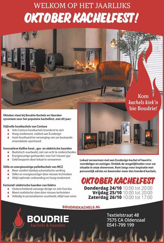 Bezoek het Oktober Kachelfest bij Boudrie Kachels en Haarden! Het Oktober Kachelfest vindt plaats van 24 t/m 26 oktober bij Boudrie Kachels en Haarden aan de Textielstraat 48 in Oldenzaal. Op donderdag 26 en vrijdag 27 oktober is de showroom geopend van 10.00 tot 20.00 uur. Op zaterdag 28 oktober bent u van harte welkom tussen 10:00 en 17:00 uur. Proef de sfeer van deze bijzondere showdagen en kom kachels kiek'n bie Boudrie!