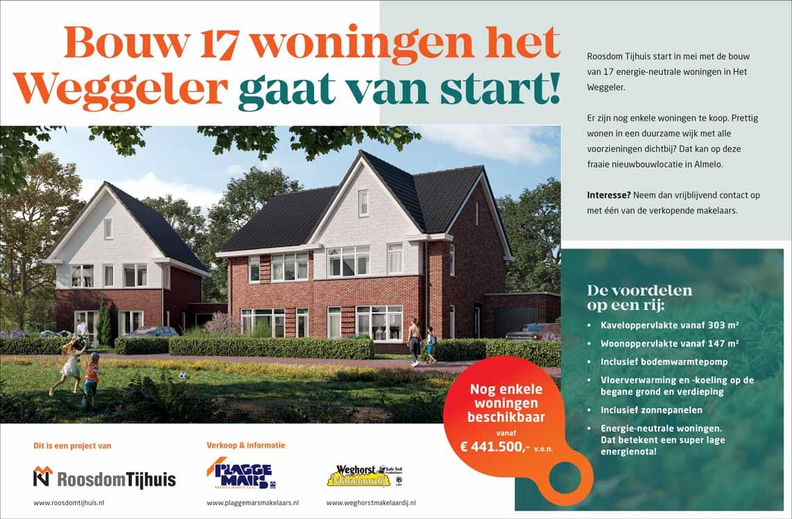 Meer informatie is te verkrijgen op www.roosdomtijhuis.nl aanbod project het-weggeler-te-almelo. Of neem contact op met één van de verkopende makelaars. Plaggemars Makelaars uit Almelo en Wierden is te bereiken op tel. 0546-57 72 of per email via info@plaggemarsmakelaars.nl.