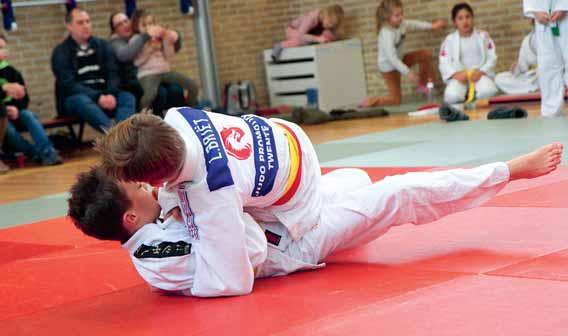 Terwijl de gewogen kinderen worden ingedeeld en de pouletjes worden geschreven, legt Ferry Evenberg de ouders het verloop van de wedstrijd uit. Hoe werkt het scorebord, wat betekenen de gebaren. Scheidsrechters en juryleden als begeleiding Regelmatig valt de partij even stil, wanneer de scheidsrechters beide judoka’s iets uitlegt over de regels: ”niet judoën met gestrekte armen, dan kun je niet lekker judoën, om de nek pakken is gevaarlijk: kijk, hier vasthouden, dan kun je goed sturen.” Zodat de judoka’s stapsgewijs de regels leren in de praktijk. De juryleden helpen de kinderen met het omdoen van de rode en witte band, leggen degenen die het willen weten uit hoe het scoreformulier werkt. ”Kijk, daar staat je naam, daar schrijf ik de punten op die jullie halen…”