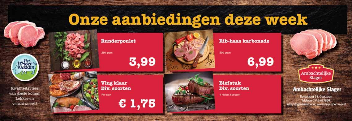 Elke woensdag: H.O.H. gehakt 500 gram......................€ 4,45 Vaste weekaanbiedingen Grillworst naturel/kaas 100 gram....€ 1,50 Vleeswaren aanbiedingen