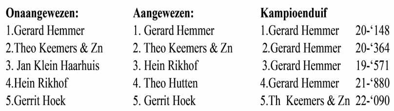 Het werd een felle strijd met volop spanning tot en met de laatste vlucht. Jos Hoek en Ben Kroeze voerden na de derde vlucht de rubrieken onaan- en aangewezen verrassenderwijze aan. Jos Hoek handhaafde zich uiteindelijk met glans en werd met voorsprong eerste kampioen natoer onaangewezen. Op de tweede plaats eindigde Jan Klein Haarhuis en derde werd Hein Rikhof. Aangewezen maakte Theo Keemers & Zn met hun prima uitslag op Mettet een reuzensprong naar plaats één. Tweede en derde werden Gerard Hemmer en Ben Kroeze. De kampioensduiven op natoer waren in volgorde één t m drie van Gerard Hemmer, Alfons Hemmer en Hein Rikhof.