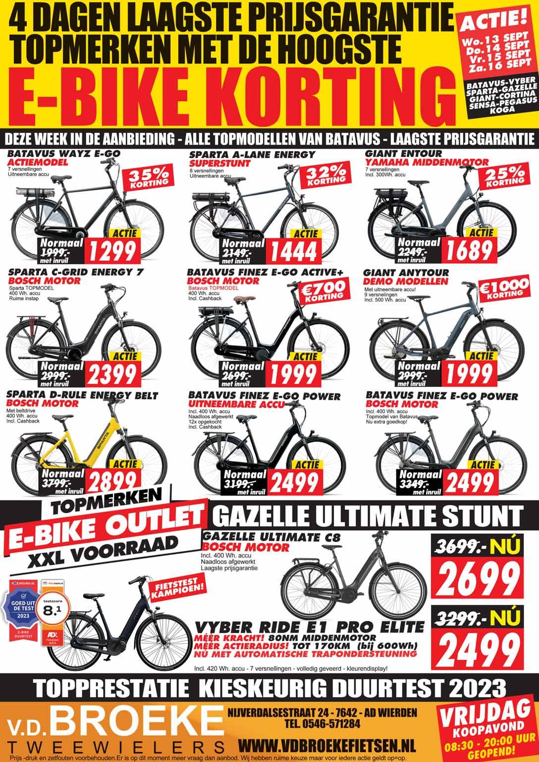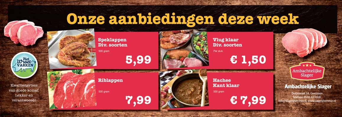 Aanbieding geldig t/m donderdag 14 september Hollandse bloemkool per stuk 1.29 Bestellen via de webshop kan ook: www.groentehaloosterik.nl Maaltijd van de week Falafel schotel 500 gram 4.99 Conference handperen heel kilo 1.29 Minimaal 50 jong gebruikte scooters En 120 nieuwe scooters op voorraad Bij aankoop van een scooter GRATIS een goedgekeurd kettingslot t.w.v. € 65,Puch E-Folk N7 Normale prijs € 1.349,00 nu slechts €999,scooteroutletalmelo.nl Nachtegaalstraat 45 • 7605 BK Almelo • Telefoon: 0546-219565 Grotestraat 56 | 7651 CK Tubbergen Telefoon: 0546-723405 | www.nielsslagerij.nl Rundersaucijsjes 100 gram...................€ 1,35 Gekruid gehakt 500 gram...................€ 5,00 Gekruide filetlapjes 100 gram....................€ 1,40 Week‐aanbiedingen week 37 Elke dinsdag: Speklappen 500 gram..............................€ 4,70 Elke woensdag: H.O.H. gehakt 500 gram......................€ 4,45 Vaste weekaanbiedingen Schouderham 100 gram....€ 1,50 Vleeswaren aanbiedingen