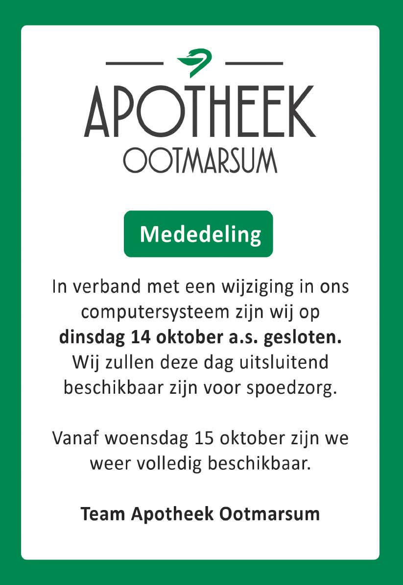 Avond- en weekendwaarneming buiten de openingstijden van de apotheken: Dienstapotheek Almelo, Zilvermeeuw 1, Almelo: tel. 0546-694343.