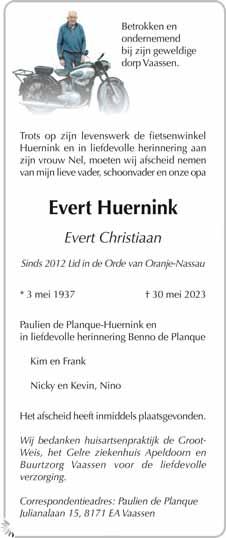 Op de leeftijd van 86 jaar heeft Vaassen afscheid moeten nemen van Evert Huernink. Een trots Vaassenaar die naast zijn levenswerk, de fietsenwinkel op de hoek van de Julianalaan, heel veel heeft betekend voor ons dorp. Om alle activiteiten waaraan Evert in zijn gelukkig lange leven heeft meegewerkt, of om alle bestuursfuncties die hij tijdens zijn leven heeft uitgevoerd te noemen, is bijna onmogelijk. Toch noemen wij hier een aantal activiteiten waar hij vele jaren aan heeft bijgedragen of waar hij ongelofelijk veel tijd en energie in heeft gestoken. (FotoV@S).