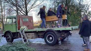 Ik vergat er bij te vertellen dat dat uitdragen door de kleinzoons werd verzorgd. Ze tilden de kist vervolgens op de vrachtwagen en op de begraafplaats er vanaf (zie foto). In een volgende column ga ik erop in, hoe de tijden zijn veranderd ten aanzien van het dragen van een overledene.