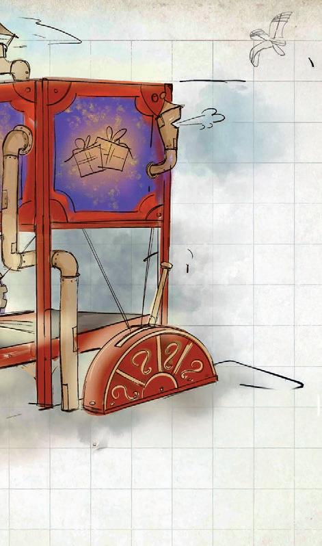 In het midden van de zaal staat een wonderlijke machine. Ze glimt van het koper, er draaien tandwielen en er klinkt zacht gezoem. Beterweetpiet streelt trots over het paneel en zegt: “Dit, Jeroen… is De Magische Pakjesmachine! Stop er een tekening in en er komt een echt cadeautje uit!”