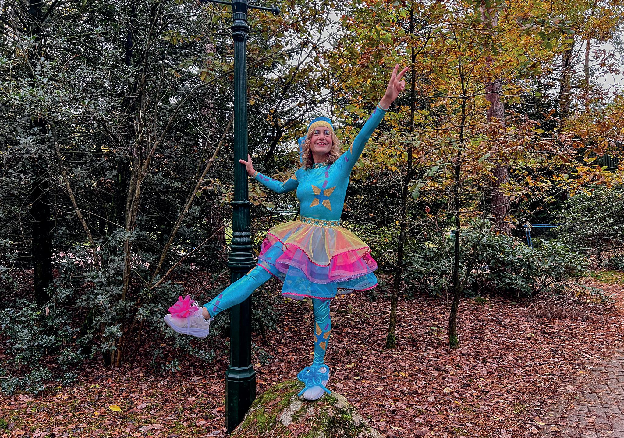 um, zwaait haar benen in de lucht en... hop!... daar staat ze, kaarsrecht op haar handen. Het publiek klapt. Kaatje, nog steeds ondersteboven, tuurt met samengeknepen ogen de straat in. “Wacht eens...” mompelt ze (wat een beetje gek klinkt als je op je kop staat). “Ik zie iets! Het zwaait! Het is... het is een Piet! Nee, het zijn twéé Pieten! En ze gooien... PEPERNOTEN!”