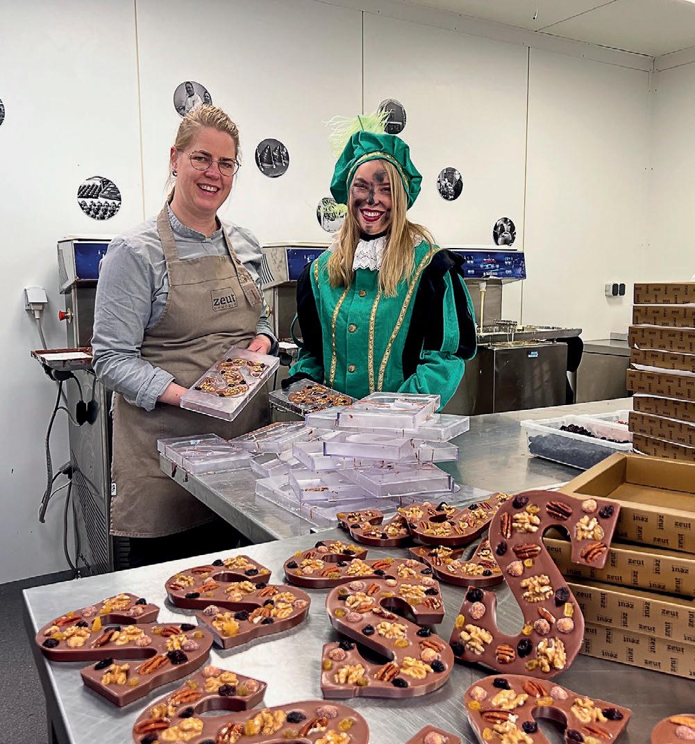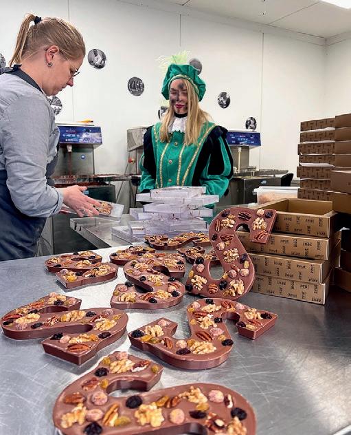 Het was een walhalla van zoetigheid. De geur van verse, rijke chocolade en cacao was overweldigend. De mooiste, glanzende letters lagen al te wachten. Dit was geen fabriekswerk; dit was pure ambacht. Tafels vol chocoladeletters, heerlijke repen en andere producten. En machines vol gesmolten chocola om nog een prachtige letter van te maken. ‘Wel 24 kg per chocolademachine’: vertelt Linda.