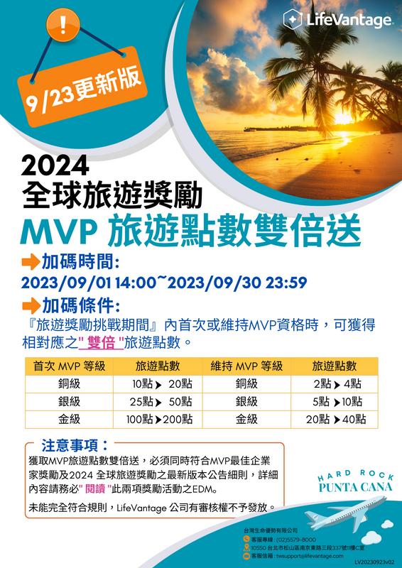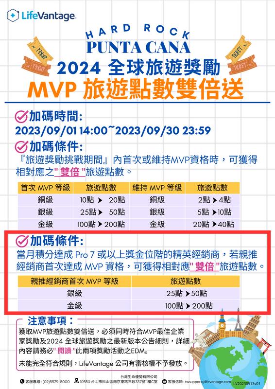 客服專線 : (02)5579-8000 10550 台 市 ⼭ 南京東路三段337 11 C室 客服信 : twsupport@lifevantage com LV20230923v02 台灣⽣命 限 司 ⾸ MVP 旅 點 維 MVP 旅 點 銅 10點 20點 銅 2點 4點 銀 25點 50點 銀 5點 10點 ⾦ 100點 200點 ⾦ 20點 40點 加碼 件: 『旅 挑戰期間』 ⾸ 或維 MVP 格 可 得 相對應之" 雙倍 "旅 點 加碼 間: 2023/09/01 14:00~2023/09/30 23:59 MVP 旅 點 雙倍 2024 球旅 H A R D R O C K PUNTA CANA 注意事項 MVP旅 點 雙倍 必須同 合MVP 佳企 家 2024 球旅 之 本 告細則 詳細 容 必" 讀 "
