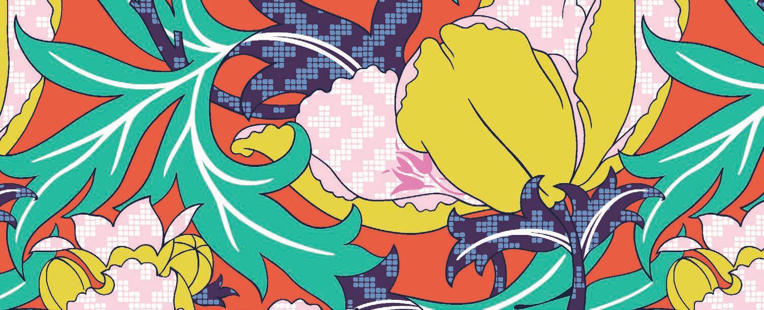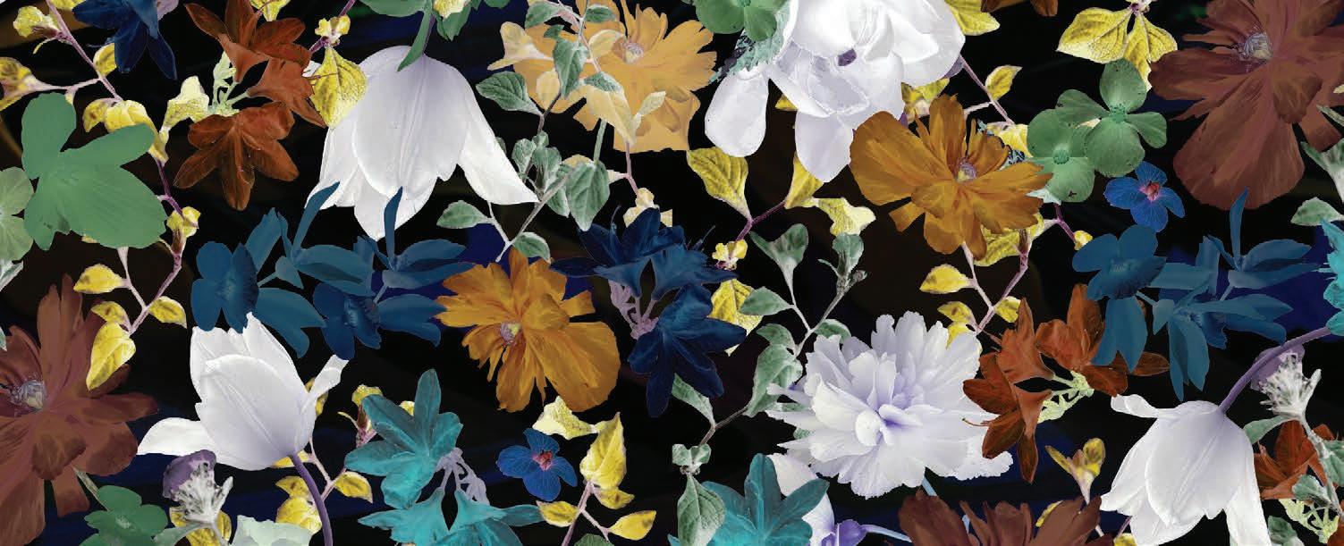 Reinventing florals for the digit al age, Cyberscape sculpts a bot anical simulation with blurred and distorted florals which pushes the boundaries of new printing technologies.