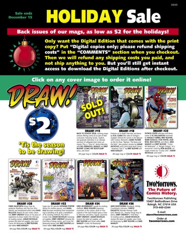 GREG HILDEBRANDT reveals his working methods, BRAD WALKER (Aquaman, Guardians of the Galaxy, Birds of Prey, Legends of the Dark Knight) gives a howto interview and demo, regular columnist JERRY ORDWAY, JAMAR NICHOLAS reviews the latest art supplies, and BRET BLEVINS and Draw! editor MIKE MANLEY’s Comic Art