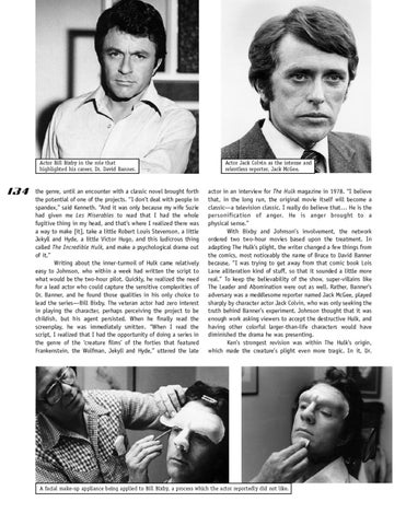 actor in an interview for The Hulk magazine in 1978. “I believe that, in the long run, the original movie itself will become a classic—a television classic. I really do believe that… He is the personification of anger. He is anger brought to a physical sense.” With Bixby and Johnson’s involvement, the network ordered two two-hour movies based upon the treatment. In adapting The Hulk’s plight, the writer changed a few things from the comics, most noticeably the name of Bruce to David Banner because, “I was trying to get away from that comic book Lois Lane alliteration kind of stuff, so that it sounded a little more real.” To keep the believability of the show, super-villains like The Leader and Abomination were out as well. Rather, Banner’s adversary was a meddlesome reporter named Jack McGee, played sharply by character actor Jack Colvin, who was only seeking the truth behind Banner’s experiment. Johnson thought that it was enough work asking viewers to accept the destructive Hulk, and having other colorful larger-than-life characters would have diminished the drama he was presenting. Ken’s strongest revision was within The Hulk’s origin, which made the creature’s plight even more tragic. In it, Dr.