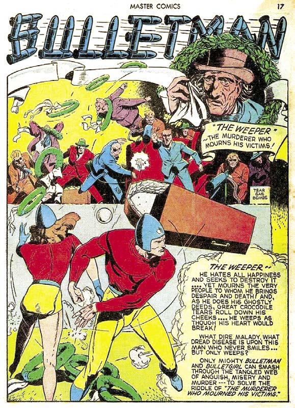 Perkins had served from 1939-42 as associate editor of Weird Tales magazine before he (at least according to Wikipedia) gained entry to Fawcett’s comics line with his “Bulletman” story introducing The Weeper, a villain who is “convinced that life is sad and it’s criminal for people to be happy.” The latter made his debut in the “Bulletman” entry in Master Comics #23 (Feb. 1942), as drawn by the Jack Binder studio; he would reappear in several later stories. Perkins’ article on comicbook scripting for the April 1943 issue of the trade magazine Writers’ Journal was quoted and discussed in depth by Will Murray in the FCA section of A/E #157. [Bulletman & Bulletgirl TM & © DC Comics.]