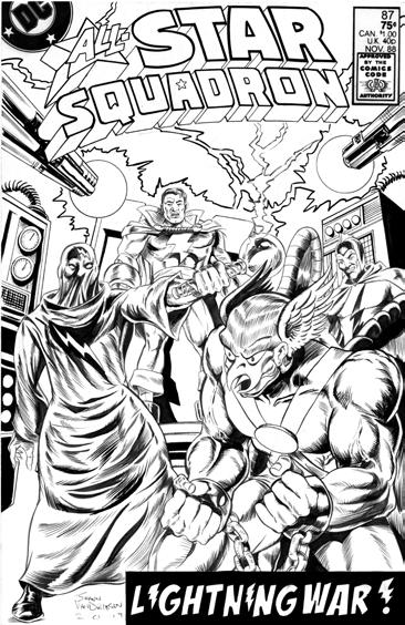 INTRODUCTION: As John Joshua knows (because I told him), his wonderful project of commissioning “faux covers” of “my” DC Comics series All-Star Squadron beyond the 67 issues (plus three Annuals) that were published between 1981 and ’87 is one I can and do applaud—even though, if he (or anyone else) were actually producing such a continuation for DC, I would never so much as pick up a copy off the racks, due to my unequivocal hostility to the notion of anyone except myself continuing the All-Star Squadron, Young All-Stars, or Infinity, Inc. series while I’m still alive. (Just keep your shirts on, guys… all things come to those who wait.) Yet, as an exercise in extreme fan creativity, I’ve been the covers series’ biggest booster, determined if possible to eventually print all of the new covers in the pages of Alter Ego—and there are now basically as many faux covers accounted for by John and his enthusiastic cronies as there were in the original series! So here we go again, with more of those covers—some colored, some not—but first, a few comments from the High Commissioner himself….