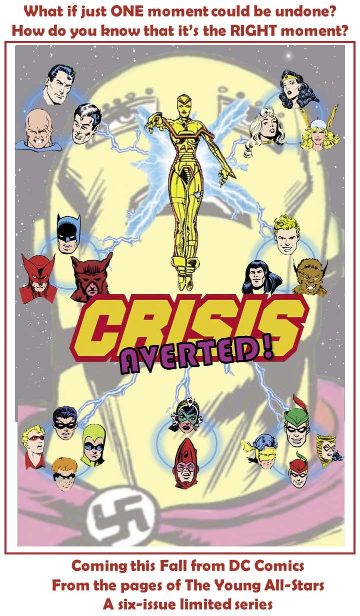 Just Imagine! JBL even composed his own “house ad” for his concept of The Young All-Stars: Crisis Averted series! [Heroes & villains TM & © DC Comics.]