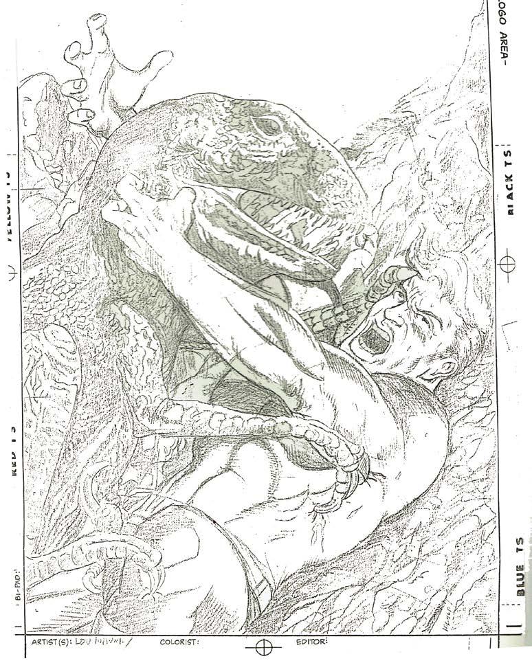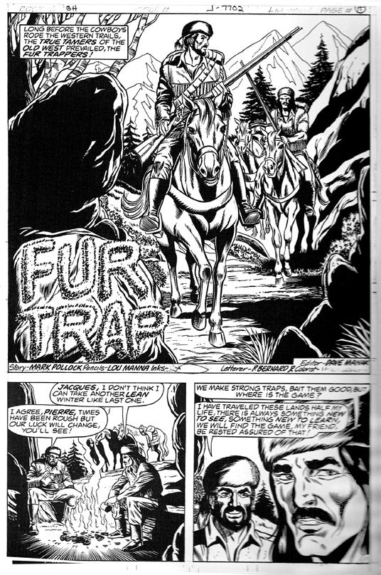 (Left:) An image of the original art for the splash page of the story Lou penciled for one of DC’s “mystery” comics in the early 1980s, which was inked by Sam Grainger and written by Mark Pollock. We couldn’t find any listing on the GCD of a story called “Fur Trap,” so either the title was changed (and the GCD didn’t catch it under its new name, either), or else that yarn was never published… though Lou did have at least one story published in House of Mystery (#306). [TM & © DC Comics.]