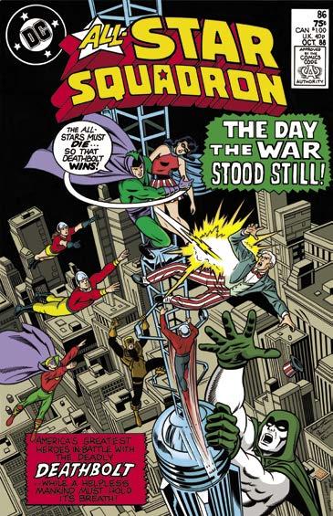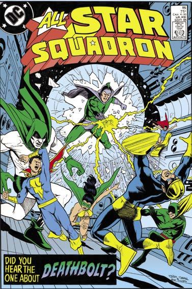#85: Art by Craig Cermak, colors by Rob Shalda; homage to Avengers #72 (Sal Buscema & Sam Grainger). Deathbolt invades the Perisphere to steal an artifact from the Squadron’s trophy room for his mystery partner. With The Spectre’s powers diminished after the events of Annual #4, can the team prevail?