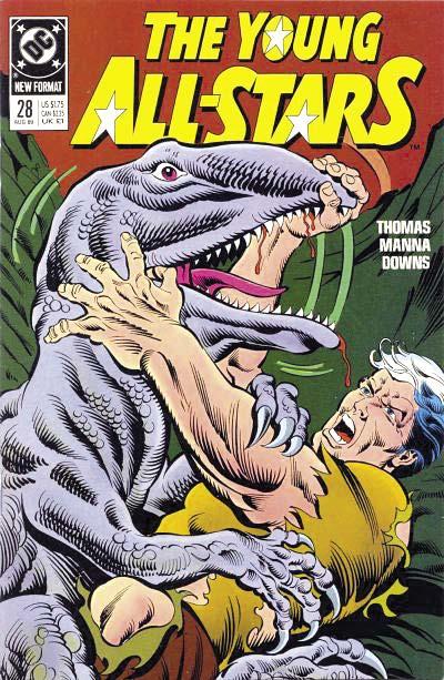 (Right:) “Iron” Munro struggles in vain to escape from a huge hunk of fused rock, in Young All-Stars #30 (Oct. 1989). Script by Roy & Dann Thomas; pencils by Lou Manna; inks by Bob Downs & Dave Simons. Thanks to John Joshua. [TM & © DC Comics.]