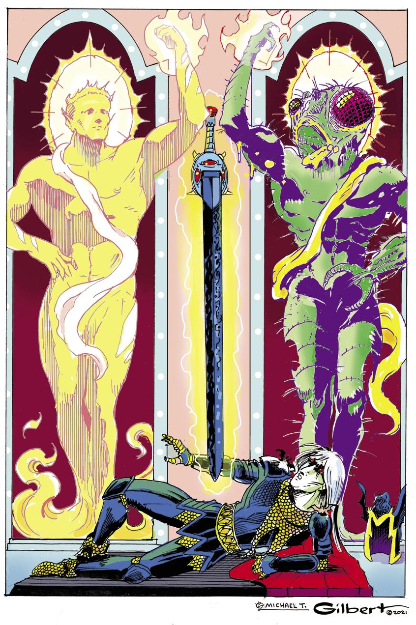 Michael T. draws two aspects of Elric’s foe, the evil god Arioch! [Characters © Michael Moorcock; art © Michael T. Gilbert.]