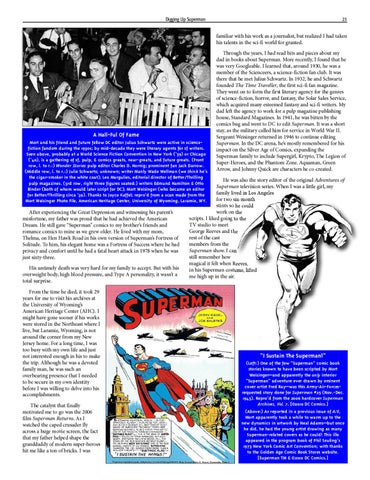 A Hall-Ful Of Fame Mort and his friend and future fellow DC editor Julius Schwartz were active in sciencefiction fandom during the 1930s; by mid-decade they were literary agents for sf writers. Seen above, probably at a World Science Fiction Convention in New York (’39) or Chicago (’40), is a gathering of sf, pulp, & comics greats, near-greats, and future greats. (Front row, l. to r.:) Wonder Stories pulp editor Charles D. Hornig; prominent fan Jack Darrow. (Middle row, l. to r.:) Julie Schwartz; unknown; writer Manly Wade Wellman (we think he’s the cigar-smoker in the white coat); Leo Margulies, editorial director of Better/Thrilling pulp magazines. (3rd row, right three figures seated:) writers Edmund Hamilton & Otto Binder (both of whom would later script for DC); Mort Weisinger (who became an editor for Better/Thrilling circa ’39). Thanks to Joyce Kaffel; repro’d from a scan made from the Mort Weisinger Photo File, American Heritage Center, University of Wyoming, Laramie, WY.