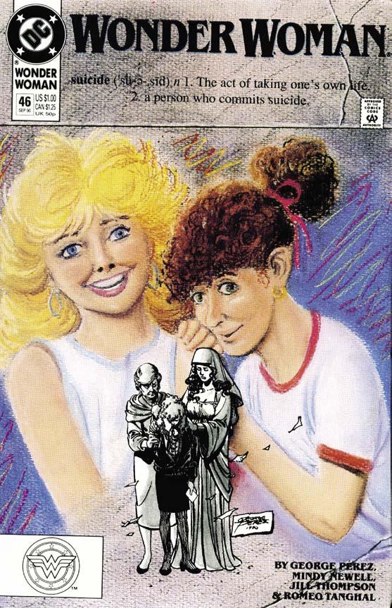 Pérez’s cover to Wonder Woman #46 (Sept. 1990), which features the heartrending study of teen suicide, “Chalk Drawings.”