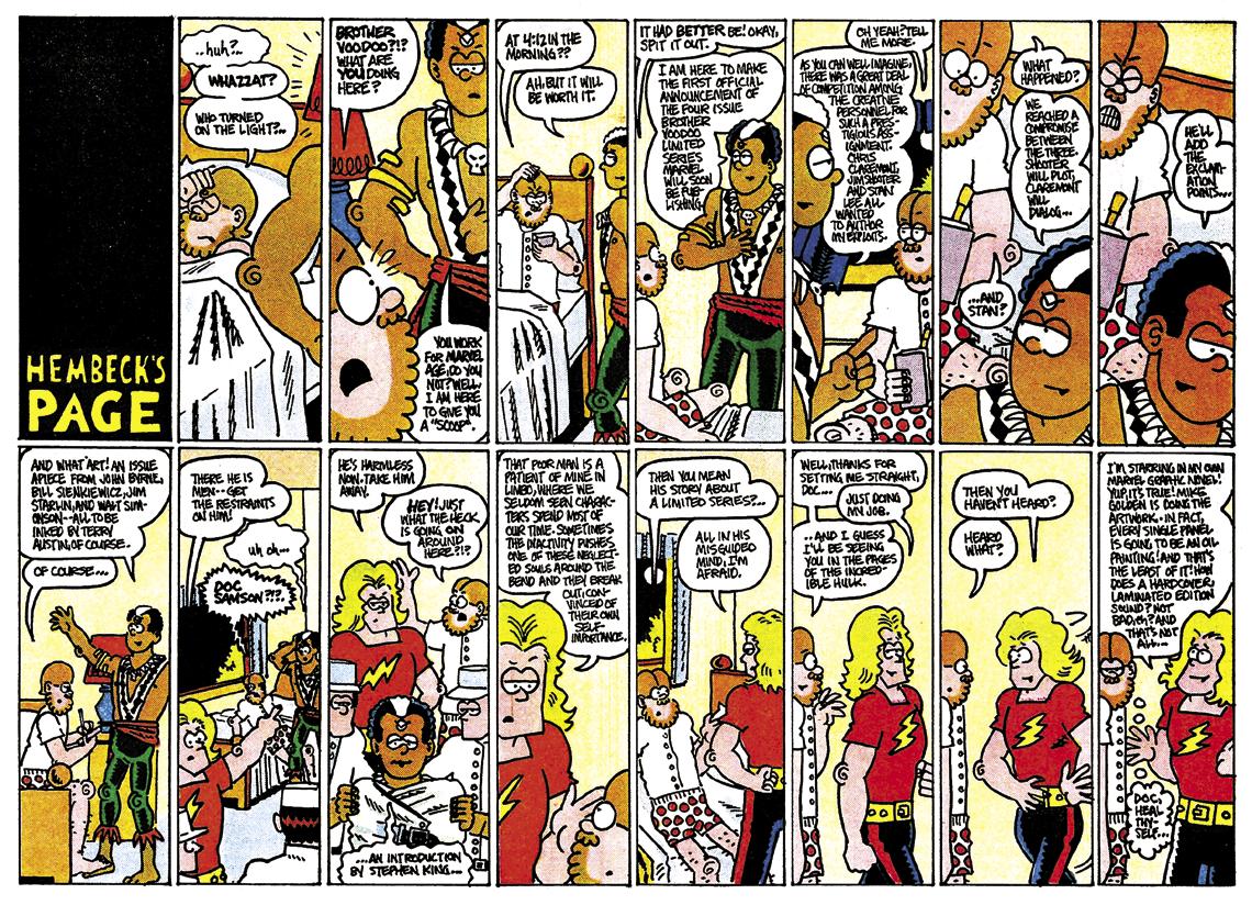Brother Voodoo and Doc Samson drop in on Fred Hembeck in the “Hembeck’s Page” (a doublepage spread) from Marvel Age #20 (Nov. 1984).