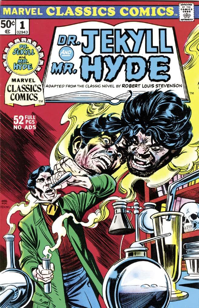 Gil Kane and Dan Adkins delivered this shocking cover for the first issue of Marvel Classics Comics (1976), adapting Robert Louis Stevenson’s 1886 novella, The Strange Case of Dr. Jekyll and Mr. Hyde. Unless otherwise noted, scans illustrating this article are courtesy of Douglas R. Kelly.